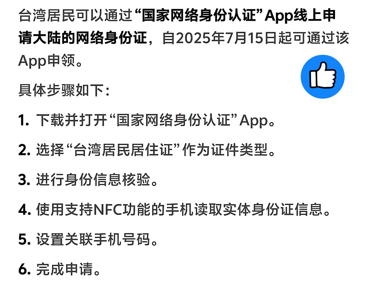 我们国家已经对台湾地区开放了国家网络身份证登记,是中国人的就去登记,不是中国人的,不承认自己是中国人的随意! 但咱得把话说明白——这登记可不是走形式,真到了涉及统一的安全关头,登了记的台湾同胞准能拿到最大保护,咱也能清楚分清谁是并肩的朋友,谁是别有用心的人。 而且别担心信息安全,咱国家对国家网络身份证的隐私保护,台湾省的中国人一样能享受到,这点绝对靠谱。 其实这事儿不只是办个证件那么简单,更是两岸同胞往一块凑、认一家人的事儿——国家统一既要地理上的合,更要咱们中国人心往一处想,登记就是给台湾同胞吃颗定心丸,让大家知道自己永远是中国大家庭的一份子。 想问问台湾的朋友们,你们身边有没有人已经登记了?要是对登记流程还有疑问,咱也能聊聊呀!