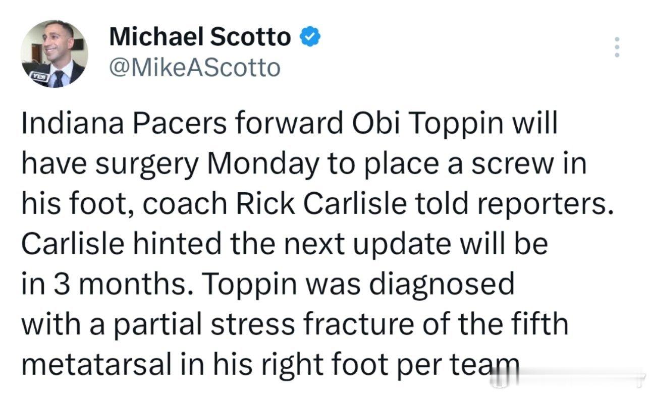 步行者前锋托平被诊断为右脚第五跖骨部分应力性骨折,手术将在其脚部植入一枚螺钉。卡莱尔暗示,下一次伤情更新可能要等到三个月后。