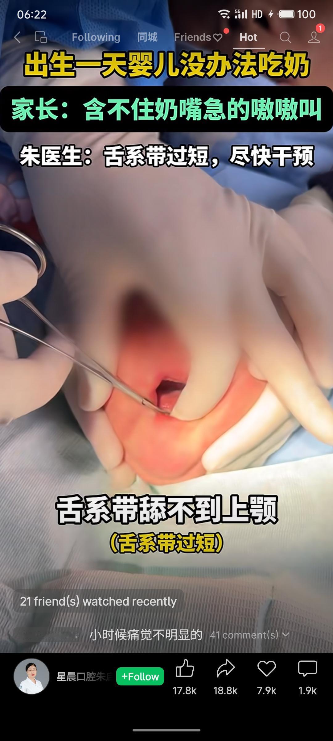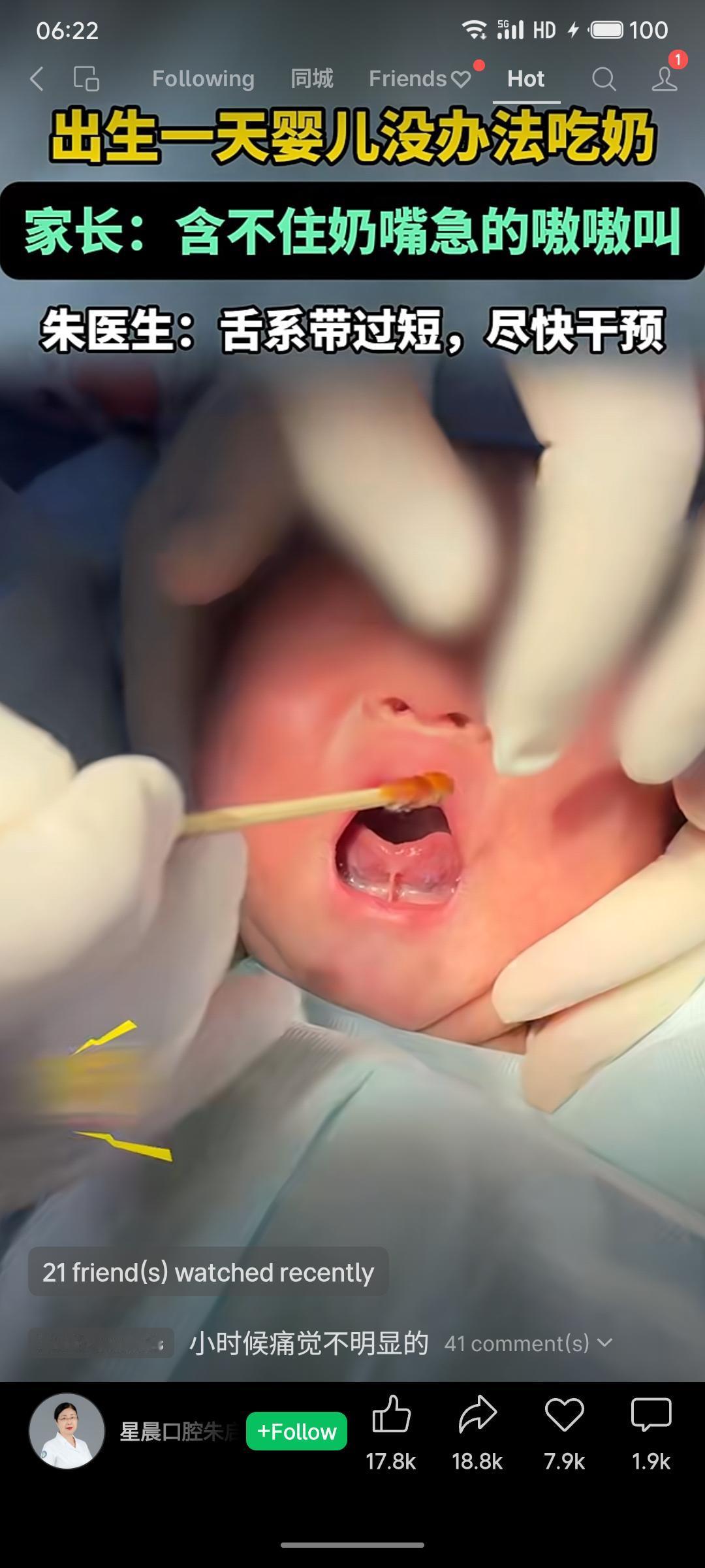 一名出生仅一天的婴儿因无法含住奶嘴、进食困难,经医生诊断为舌系带过短。医生建议尽快干预治疗,以解决喂养问题。
