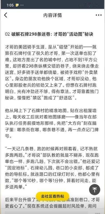 石牌村的迷宫,不少骑手都不敢进去,但宋炳才不一样。他这十年,几乎每天穿梭在这片迷宫般的巷子里,早就把每一条巷道都摸透了。作为一名退伍老兵,他的韧性和细心让他找到了在这片“外卖禁区”里稳稳跑单的节奏。宋炳才自己都说,走这些路就像回到了部队,记地图、定方位,是他最得心应手的事。 想起当年,刚退伍时的宋炳才,生活一度迷茫。做过保安、做过物业,工资少得可怜,还得撑起一家人的开销。两个孩子,爸妈的病情,所有的责任都压在他一个人身上。工作时总有种没有安全感的焦虑,尤其是那时候做外卖,单量时多时少,收入不稳定。直到2016年,他决定试试美团外卖平台,那个时候的他或许没有意识到,这个决定会改变他的一生。 跑单最初很辛苦,石牌村那边不光是道路复杂,还常常碰到天气不好影响配送。那段时间,宋炳才天天都在思考如何能提高效率,“不管是加班,还是调整路线,我不允许自己犯错。”他通过精确记住每一条街道,甚至知道哪个路口等红绿灯的时间最长。久而久之,这些细节变成了他不可或缺的“战术”。他现在已经稳稳地占据了站点前十,有时还能拿到第一。 这些年来,他的收入一直稳定在每月两三万,在行业里属于很不错的水平。美团提供的保障让他更有动力,夏天的高温补贴、雨天延时的帮助,让他觉得“跑单不再是单纯的体力活,还是有保障的”。收入也被用在了实实在在的地方:他先是在老家买了房,现在广州也有了属于自己的公寓。 想起最初的艰难日子,宋炳才深知稳定的工作带给自己的不仅是收入,更多的是安心和对家庭的承诺。如今的他,已经不再是那个生活困顿的退伍老兵,反而成了“石牌村活地图”。他用自己的努力和美团的保障,走出了一条属于自己的稳步前行的路。这份工作,对他来说,不仅是职业,更是依托生活、实现梦想的依靠。