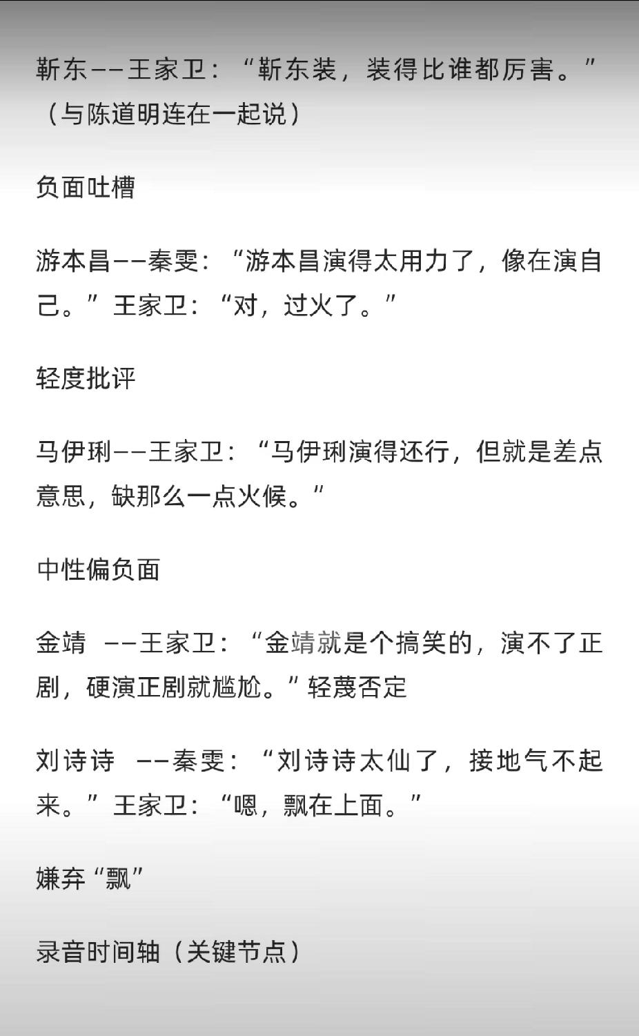 王家卫导演点评演员没什么问题吧!单就这一段没看出来有什么问题,人家是导演,跟演员们真正的接触过、合作过,演员们私下为人处世什么样,比我们知道了解的多。我们看到的明星都是T台上、荧幕上,被光环包围下的一面,私下什么样普通人谁知道,再说了八卦明星不是茶余饭后的小乐趣吗,王家卫也是人,跟朋友在一起聊聊天、讲讲小话,也无伤大雅!倒是传小话的人应该防着点!