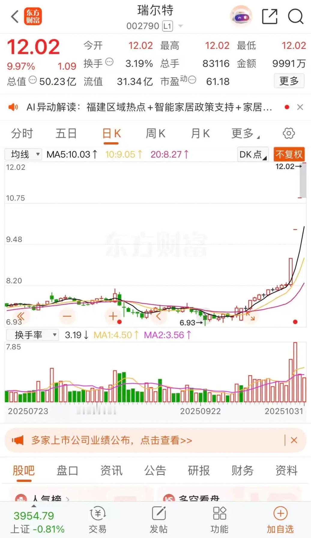 瑞尔特涨停板收盘报收12.02元每股,成交金额9991万元,大福建最近很猛多只涨停股表现不错,是不是台湾要收复了,那天中央还把10月25日定为台湾光复日。