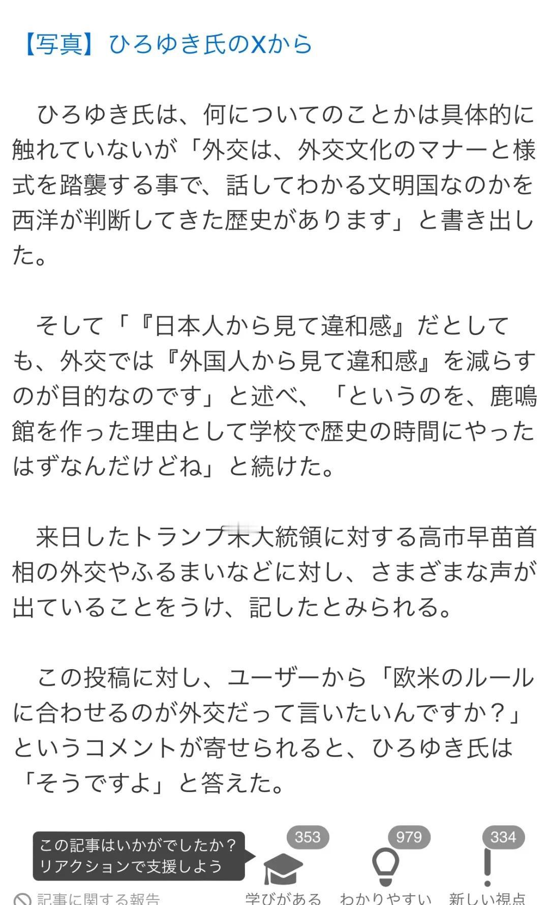 2ch创始人西村博之为高市外交辩护 翻译: 西村博之就高市外交受到的部分批评发表个人见解:“这本该是学校历史课上学过的东西啊” 日本“2channel”论坛创始人、网名为“Hiroyuki”的西村博之(48岁),于11月1日更新了他的X,就“外交”问题发表了个人见解。 尽管西村未具体点明所指何事,但他写道:“所谓外交,就是一个国家通过遵循国际外交文化的礼仪与模式,来让西方世界判断自己是否属于‘能沟通的文明国家’——这就是外交的历史。” 接着,他表示:“即便某种做法‘在日本人看来有违和感’,外交的目的,也正是为了减少‘在外国人看来有违和感’。”他继续补充道:“建造鹿鸣馆的理由,不就是为了这个吗?这本该是学校历史课上学过的东西啊。” 此番言论,是针对近日来访的美国总统特朗普,高市早苗首相对其所采取的外交方式及言行举止招致了各种批评声音而发表的。 针对这篇帖子,有用户评论道:“您的意思是,迎合欧美的规则就是外交吗?” 西村直截了当地回答:“是啊(そうですよ)。” 日本生活 日本 西村博之