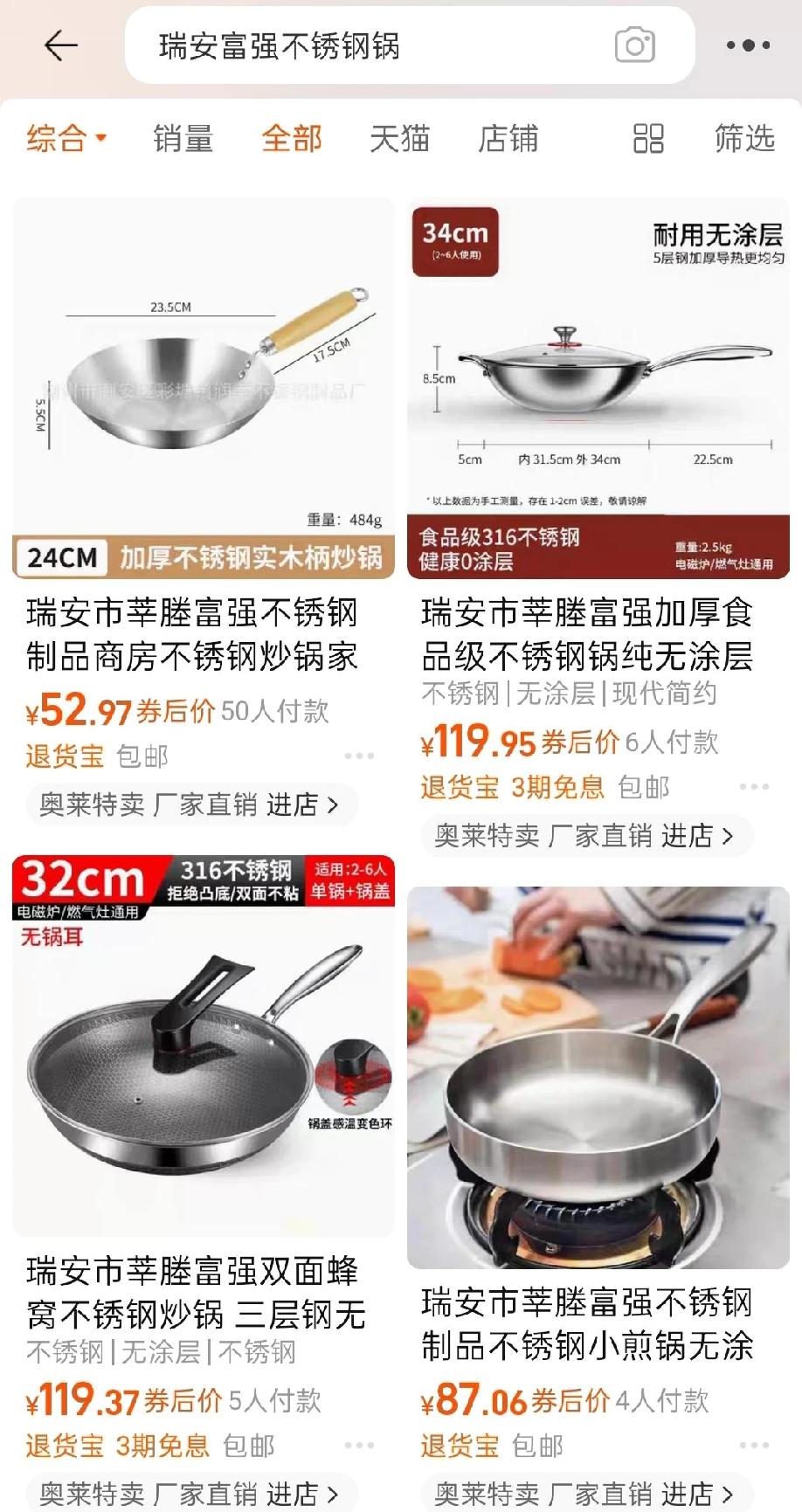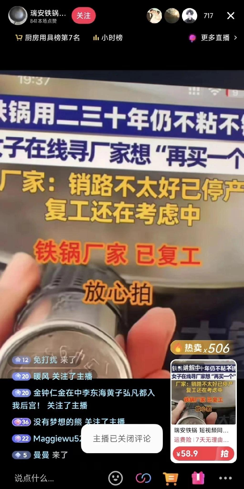 明晃晃的欺诈,真“传家锅”零件都还没配齐,网上已经卖疯了,某直播间明目张胆的拿原视频宣传,称自己就是瑞安富强铁锅厂家,并且销量已经干到厨房用具榜第7名了,可见销量不错,已有许多人上当受骗了,傅老板忙着造锅,还腾不出手来治这些假冒伪劣产品,等上了正道,一定要起诉维权,把好名声都给败坏净了!