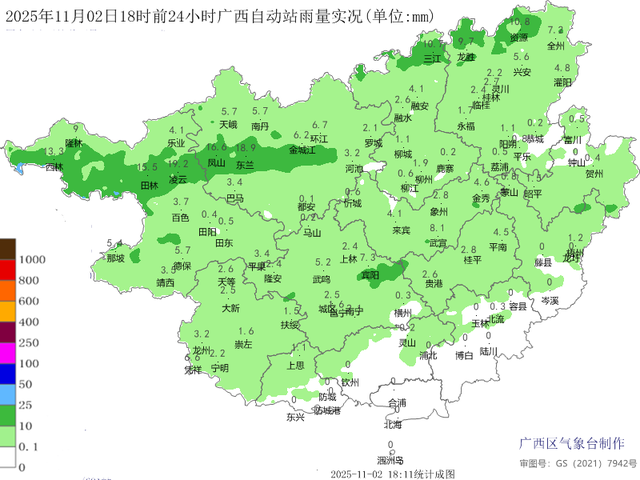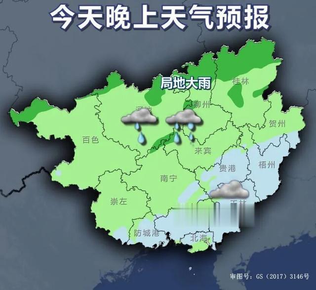 今天晚上,桂林、柳州、贺州、来宾、河池、百色、崇左、南宁等市有小到中雨、局地大雨,其它地区阴天有分散小雨。