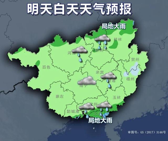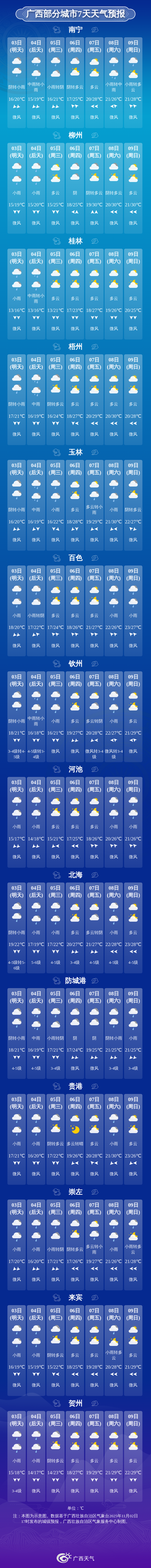 明天白天,玉林、北海、钦州、防城港、桂林、柳州、河池、百色等市有小到中雨、局地大雨,其它地区阴天有小雨。