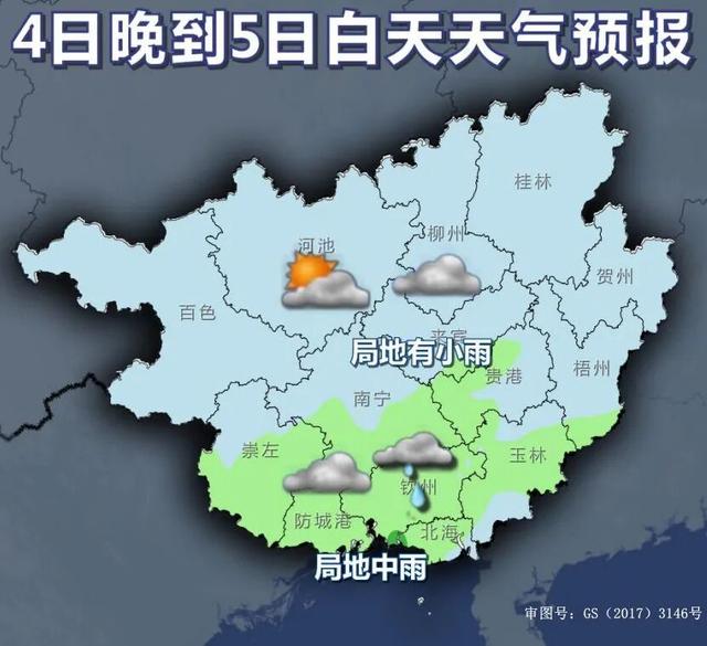 4日晚上到5日白天,桂南部分地区阴天有小雨、局地中雨,其它地区多云到阴天局地有小雨。各地气温:桂北12~23℃,桂南16~24℃。