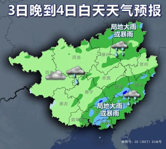 3日晚上到4日白天,桂东和沿海部分地区有中雨、局地大雨或暴雨,其它地区阴天有小雨。各地气温:桂北11~19℃,桂南15~22℃。