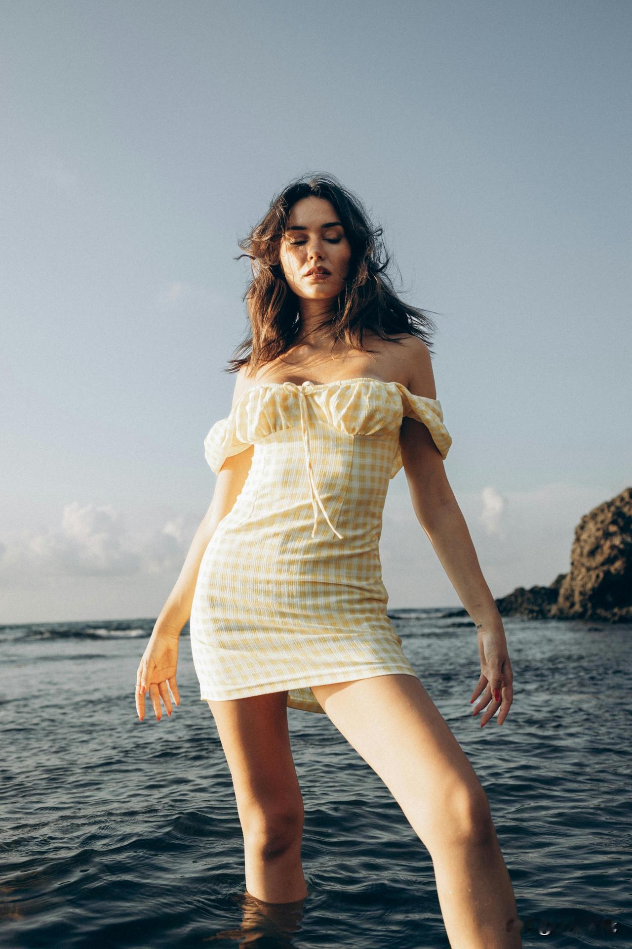 【黄裙海浪间|三组镜头定格海边度假的高光时刻】🌊 当格子黄裙遇见碧海晴空,每一帧都像度假明信片上的完美画面!露肩设计与褶皱裙摆在浪花间轻盈起舞,海风拂起卷发的瞬间,连发丝都浸满阳光的味道。 最爱那些不经意的灵动时刻:站立浅滩时腰际流转的光影,侧身戏水时红指甲与浪花的俏皮碰撞,还有漫步沙滩时裙摆勾勒的惬意弧度。从自信远望到闭眼感受海风,三组姿态将海边假期的松弛感演绎得淋漓尽致。 海边最美风景