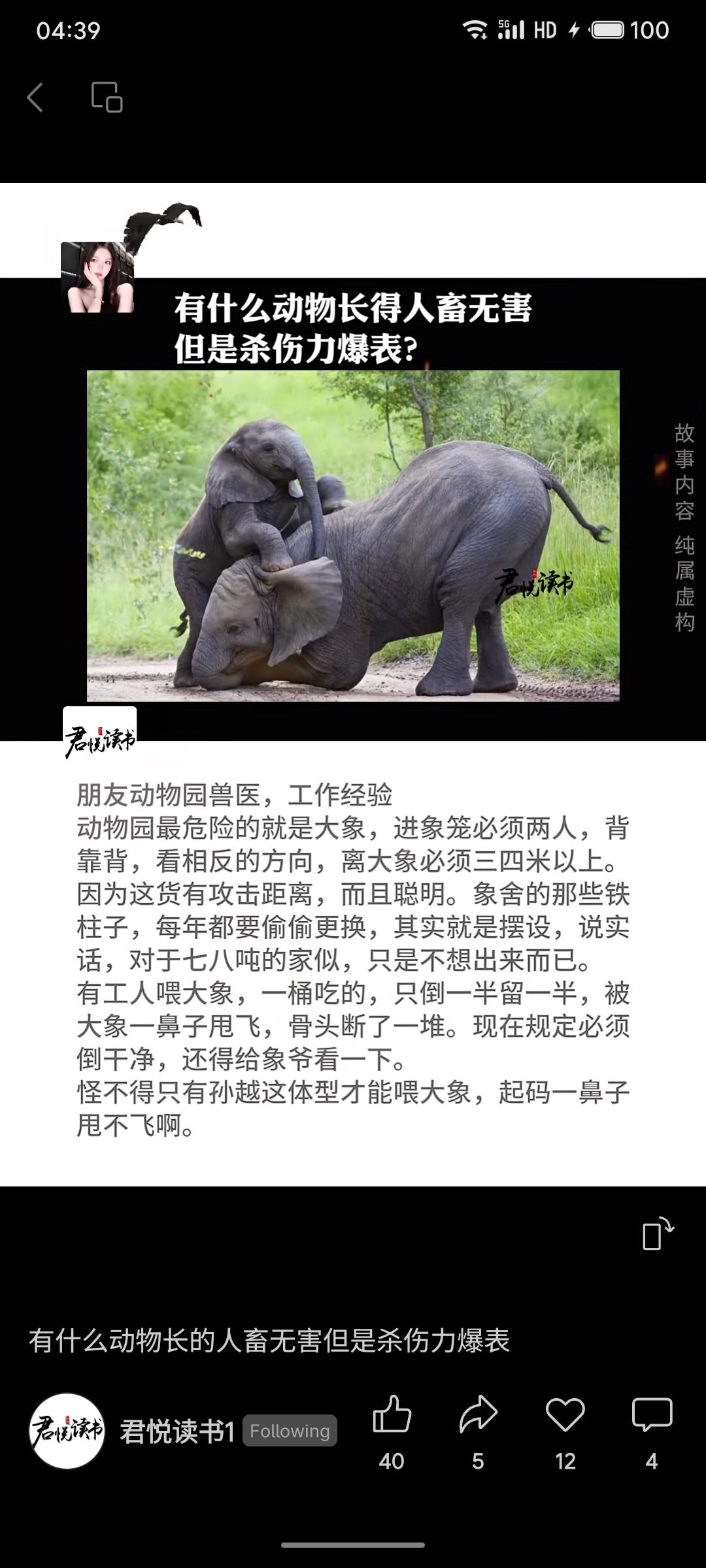 外表温顺的大象实则极具危险性。它们力量巨大、聪明且有攻击性,动物园需严格执行双人操作、保持安全距离等规范,曾有饲养员因未倒空食桶被象鼻甩飞致重伤。