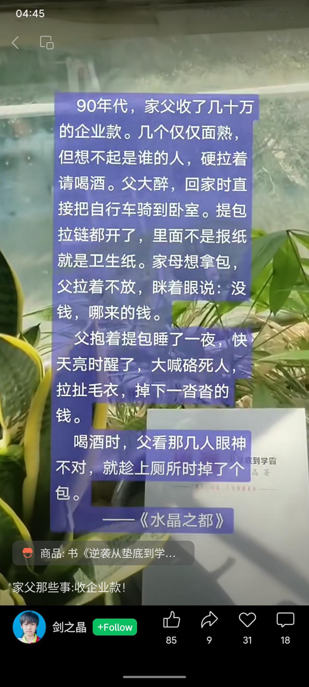 90年代,用户父亲收取企业款几十万后,被几个面熟的人灌醉。他察觉有异,借上厕所时将装钱的提包调换成装满报纸的假包,最终成功保住钱财,安全回家。