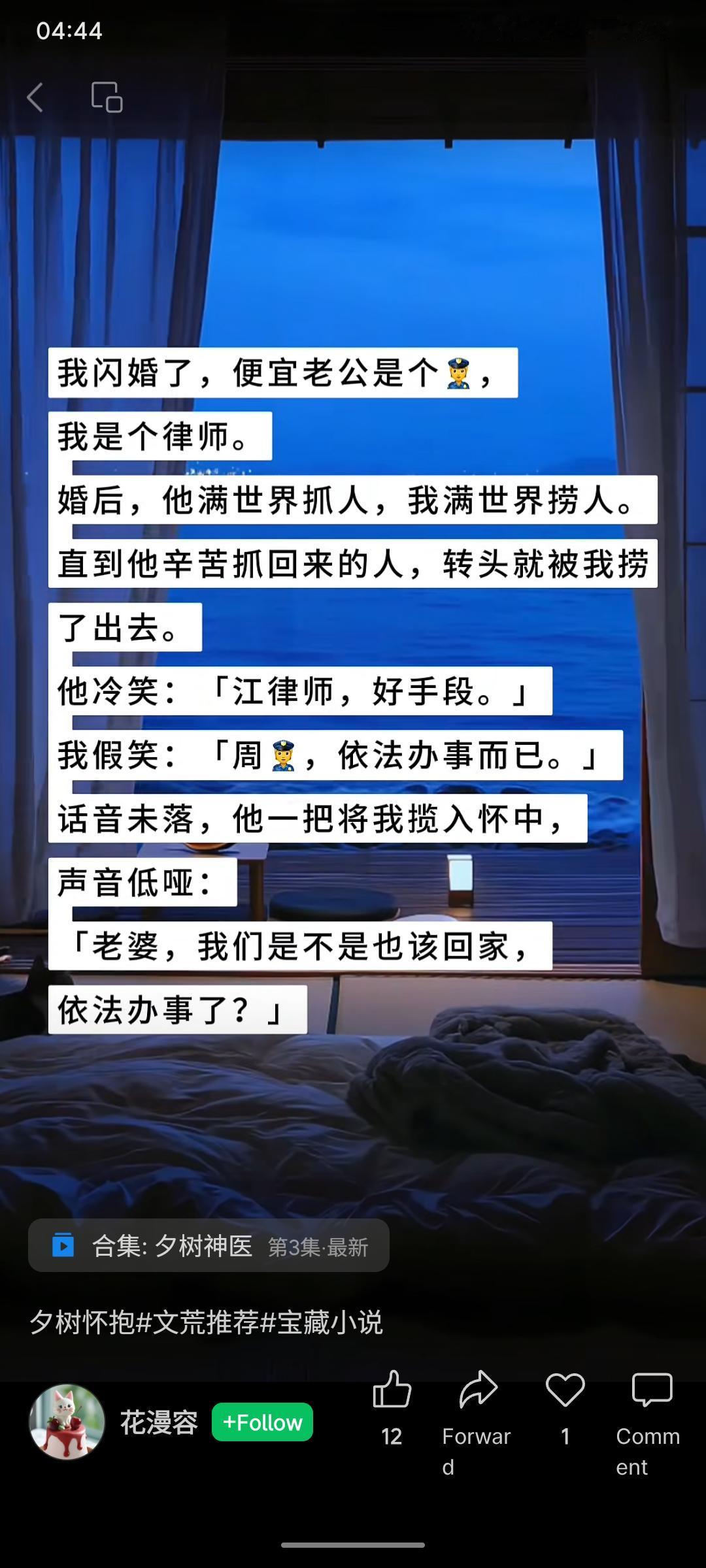 一段网络小说片段:女律师与警察男主闪婚,两人职业对立——他抓人她捞人。在又一次成功"对抗"后,男主以"依法办事"为名,强势提出要回家和妻子"依法"处理私事,情节充满张力与暧昧。