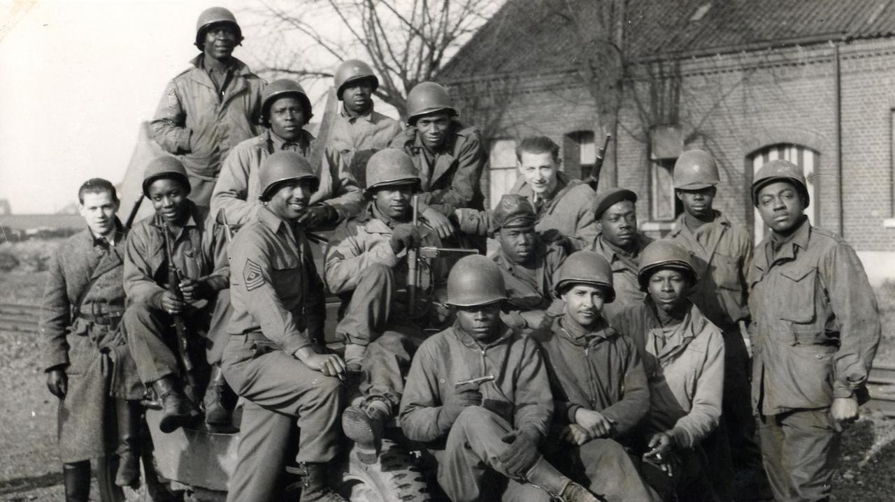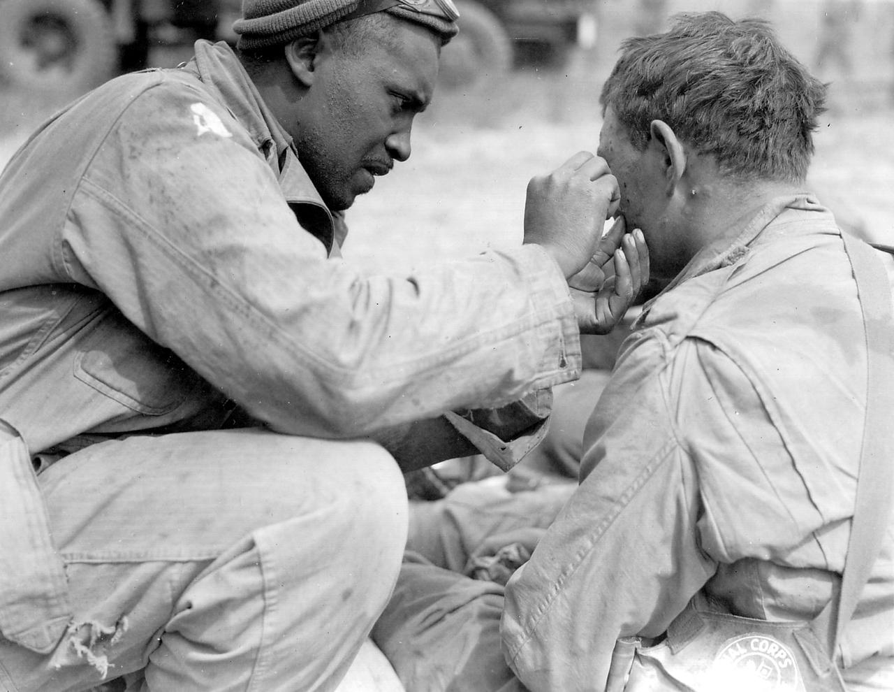 1944年6月8日,一名美军黑人士兵正在照料被榴霰弹击中面部的战友。这是诺曼底登陆(D日)后第二天,盟军正巩固滩头阵地并向内陆推进,德军仍持续组织反击。 当时美军中仍在实施种族隔离,非洲裔士兵当时多被编入后勤部队,但诺曼底登陆期间部分黑人士兵仍承担了前线弹药运输等危险任务。