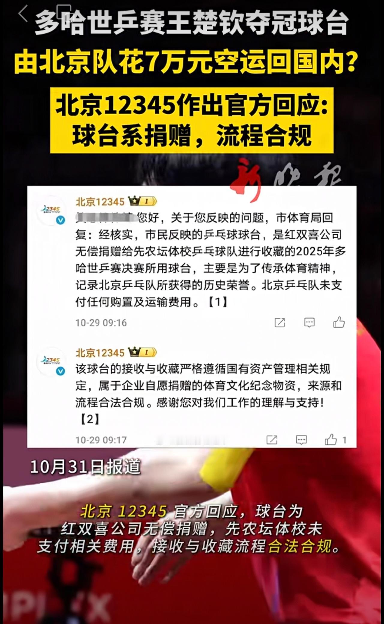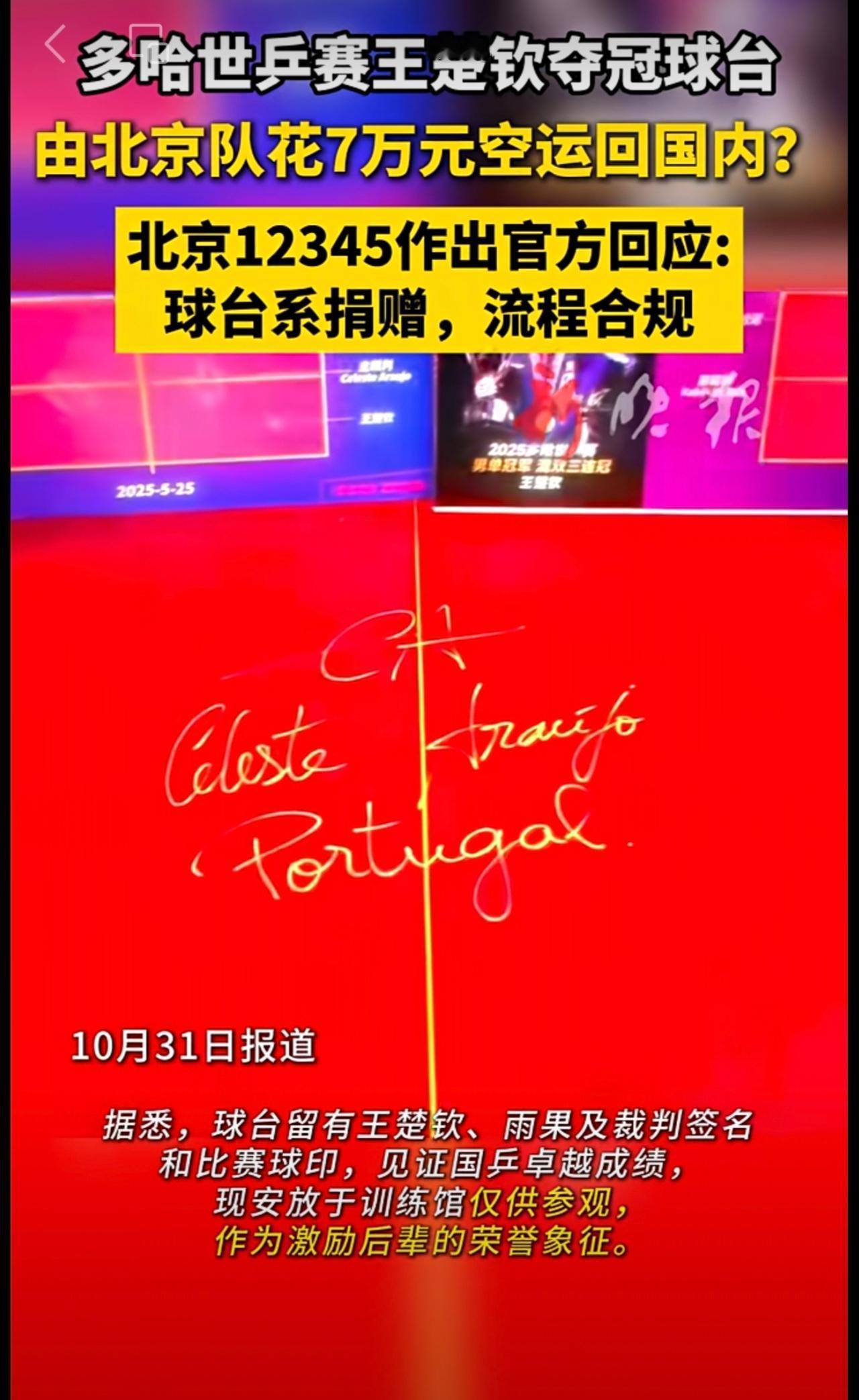 多哈世乒赛王楚钦夺冠球台,由北京队花7万元空运回国内?北京12345作出官方回应:球台系捐赠,流程合规。王楚钦 多哈世乒赛 冠军球台 红双喜 (来源:扬子晚报|实习编辑:陈卓|初审:郭启迪 | 复审:范思瑶 | 终审:刘鹏 | 校对:周正 )