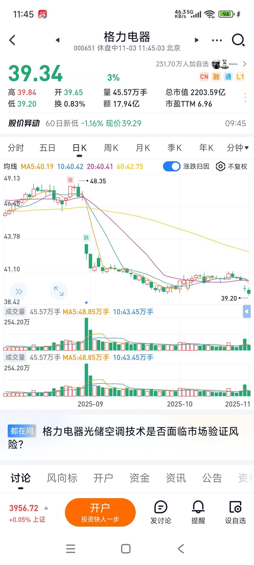 格力电器继续下跌,创了近期新低,当然跌多了到时候也会反弹下的,可图形趋势是会进一步下跌...这一次估计会缓缓跌到35块到37块的区间... 格力电器目前的问题是业务没有暴点,单一,竞争力大,竞争对手发展太猛了... 明年国补退潮,营收与净利大概率进一步下跌...
