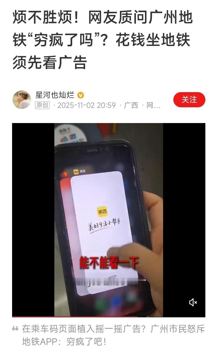 电视机开机有开机广告,看连续剧有广告,现在,连地铁都要看广告。入闸时刷码,手机先跳出广告,你还得先看,不看打不开闸门,人进不了地铁闸门。 现在真是无处不广告。 地铁入闸要看广告,是地铁的创收,入闸先要摇一摇,看一看广告。 地铁多了一笔收入,可网友怒了。地铁你是穷疯了吗? 只怕以后到商场,到超市,回家坐电梯,都要看一看广告了。 就问你烦不烦!
