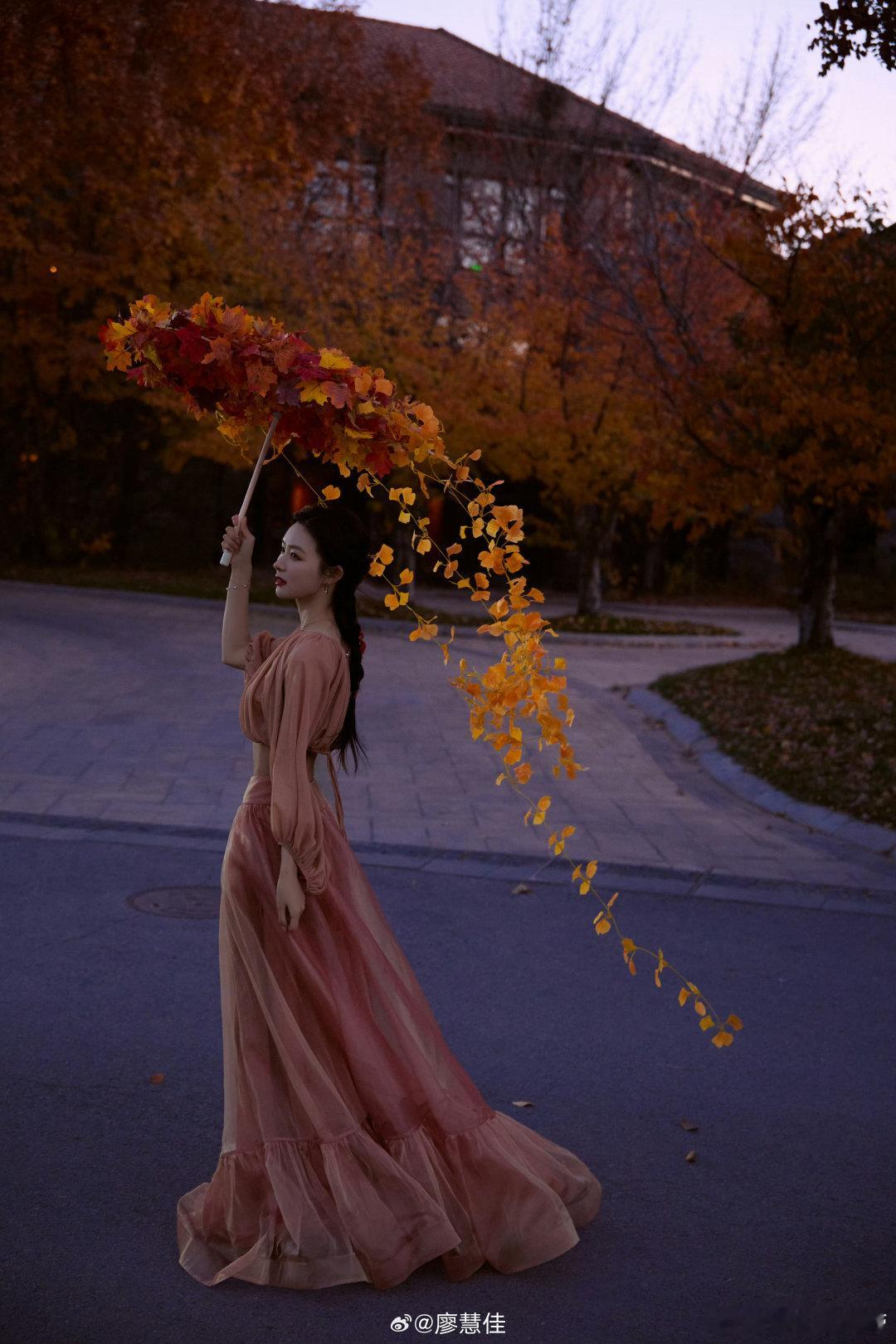 谁给廖慧佳做的伞 廖慧佳的伞藏着秋天!梧桐+银杏叶手工打造,伞尾飘飘超灵动,头发别着树叶,纱裙配落叶,自然舒服的美感拉满,这把伞真的太出片了!