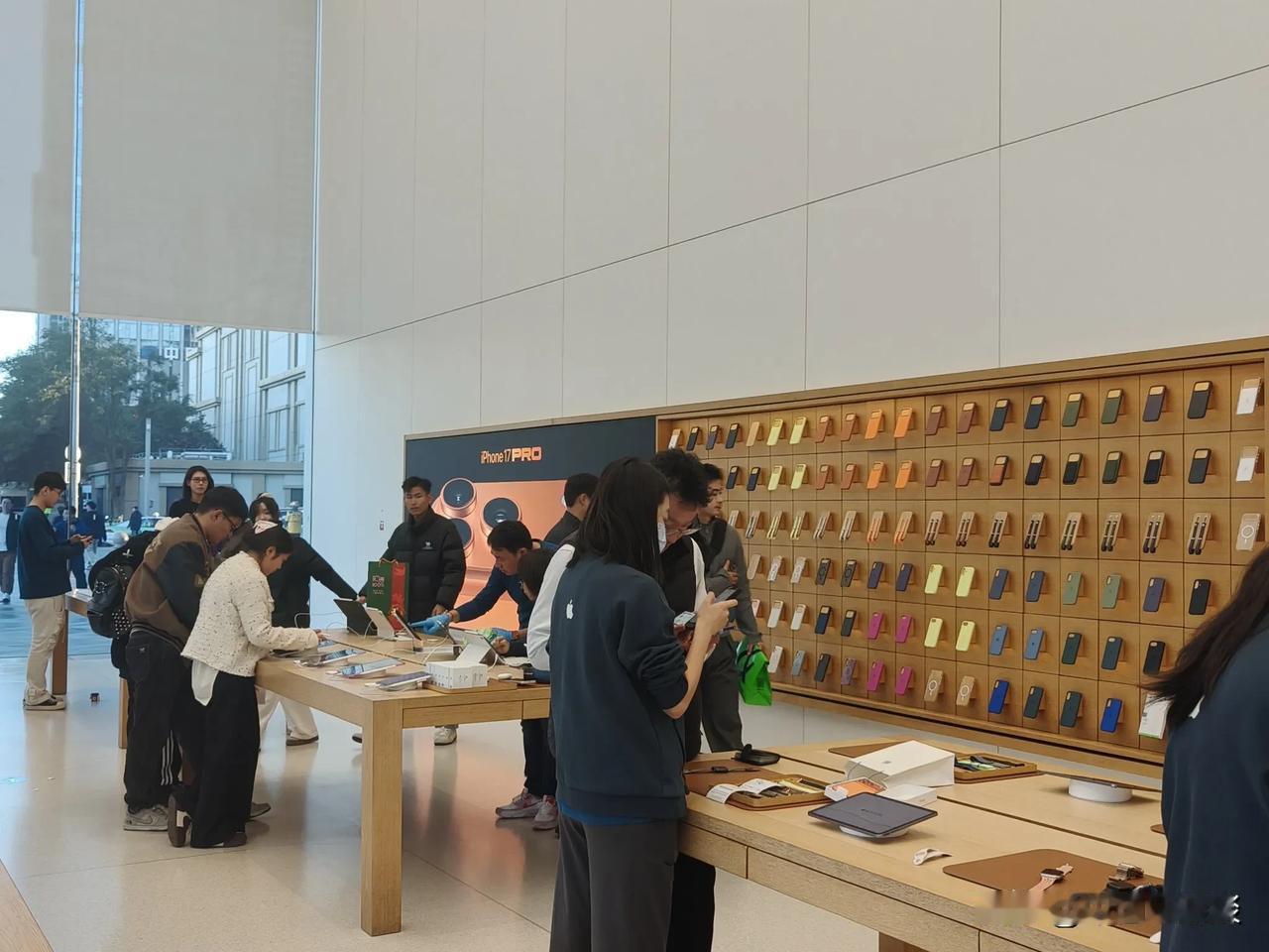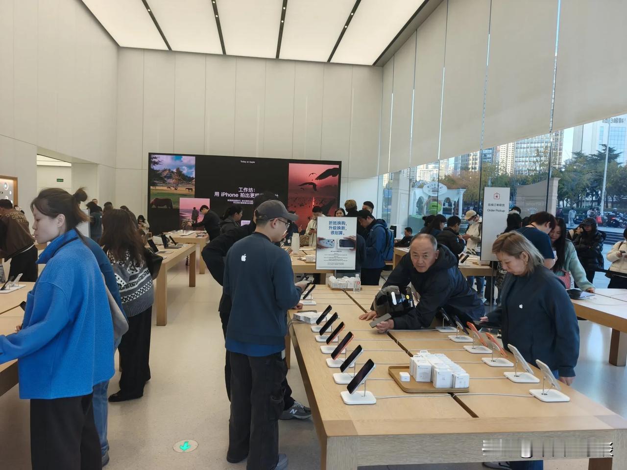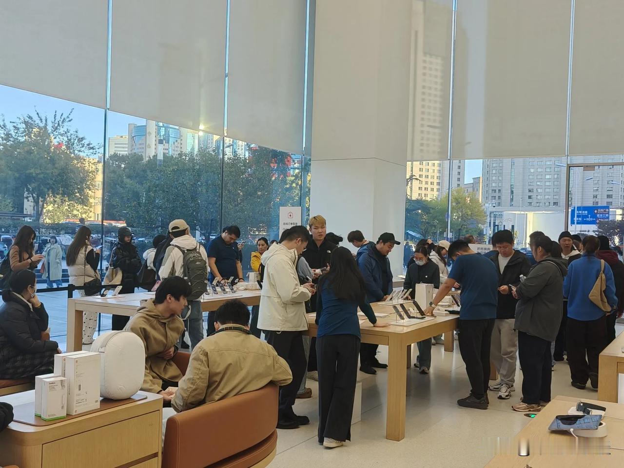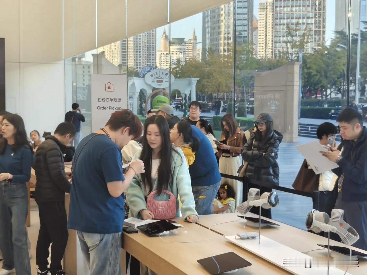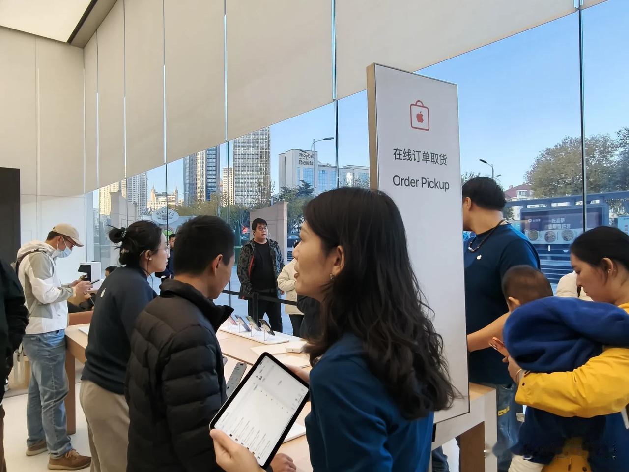 工作日的下午,苹果店依然人头攒动,预约取机需要排队,Apple的魅力还真是让人羡