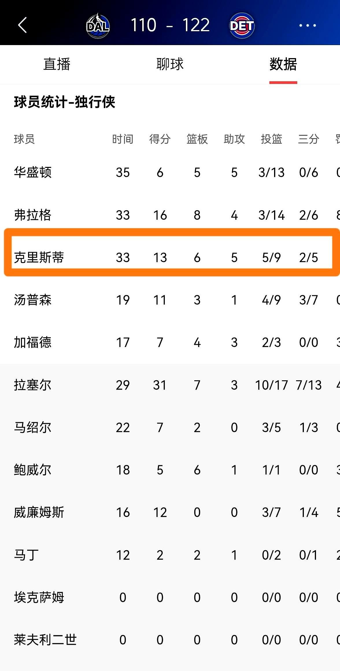 独行侠又输球,但球迷的吐槽声里多了一句“先别摆烂,看看克里斯蒂”,从NBA官网给出的技术统计看,这位首发小将交出9中5的命中率、13分6板5助1失误的数据包,虽然比分定格在110比122,但他在33分钟里把自己写进了达拉斯接下来赛季的主线剧情。 如果只盯分数,克里斯蒂的13分不算炸裂,可当你回看录像会发现他在第二节连着两次突破吸防后妙传外线,队友空位却铁出天际,这些助攻没被记进账,却让人看到他阅读防守的那股老练味,ESPN赛后也在解说区强调他的正负值一度是全队最高,可惜末节被换下后场面迅速塌方。 问题来了,卢卡单核模式下的达拉斯最缺什么,不是投手,而是能在弱侧站住脚的攻防转换器——布洛克老了、格林还嫩,克里斯蒂的侧翼对抗和低失误率刚好填那块空,赛季至今他的场均失误只有0.8次,据Basketball Reference显示,在出场时间超过30分钟的年轻球员里能排到联盟前五,这才是基德反复给他机会的底气。 当然,新人再香也只是配角,独行侠本季要追季后赛就得让东契奇肩膀轻一点,管理层下周交易截止日前会不会再补一位靠谱防守锋线,还是继续赌克里斯蒂成长,拭目以待,也欢迎在评论区留下你的方案,说不定下一个被点赞回怼的就是你。