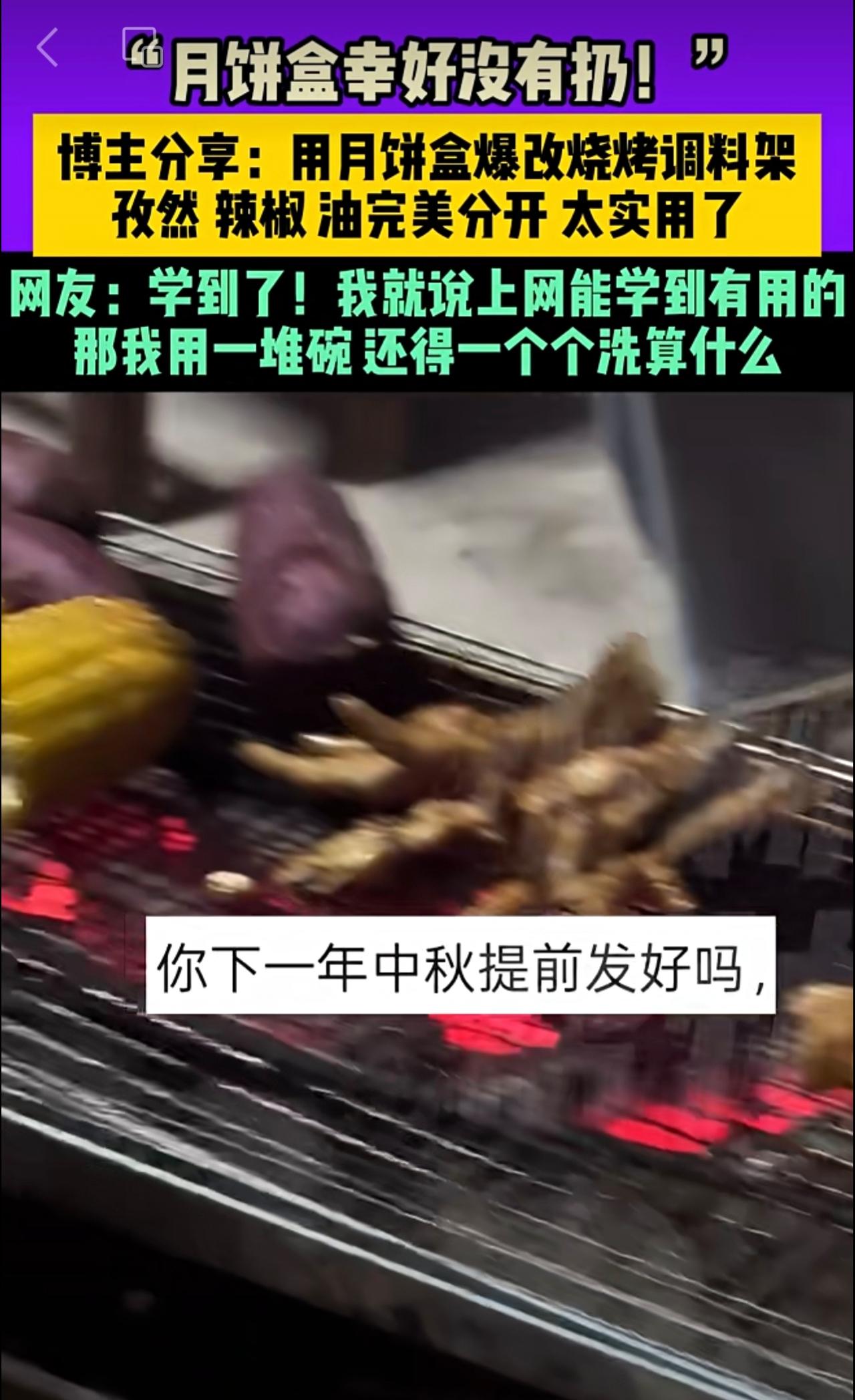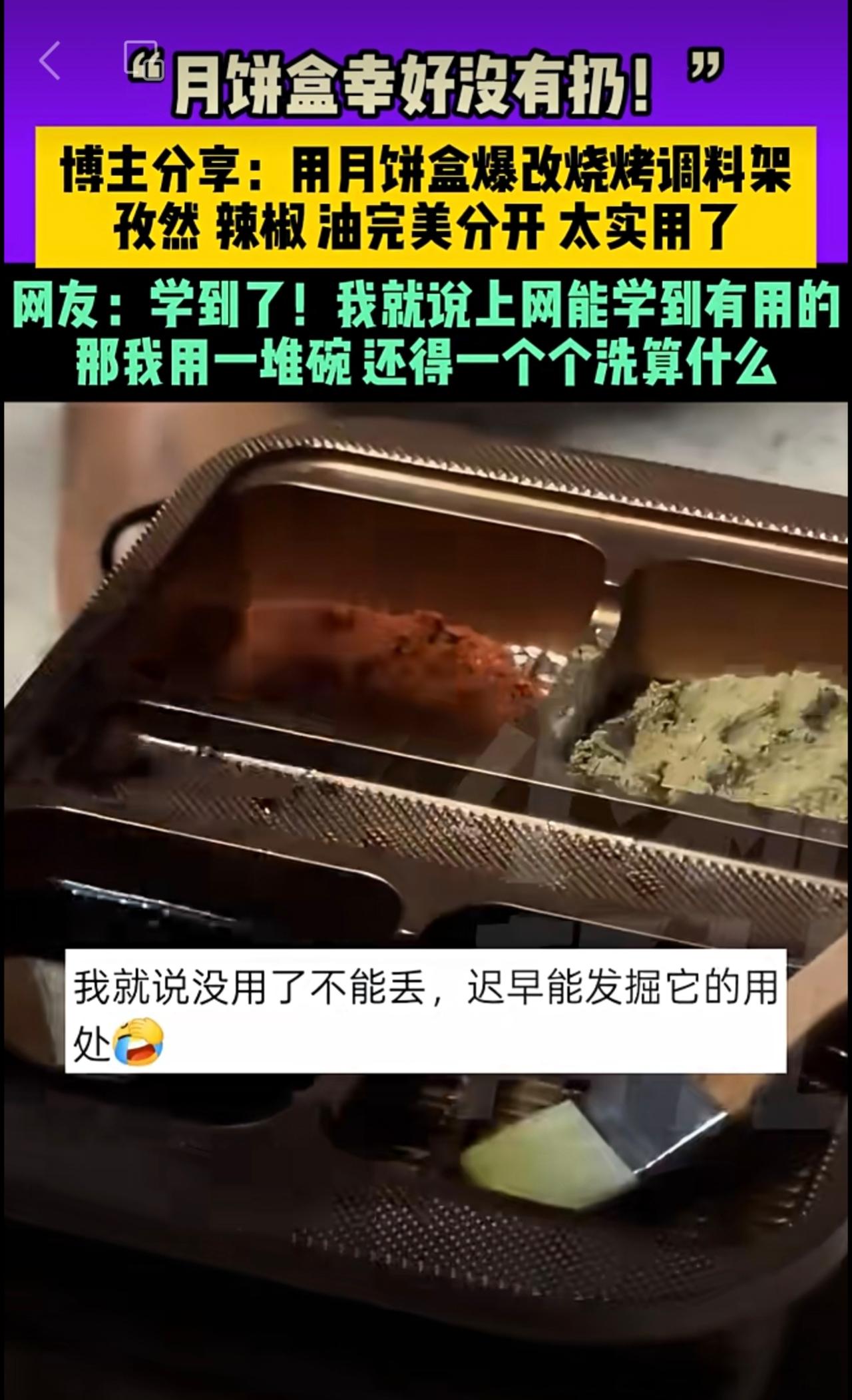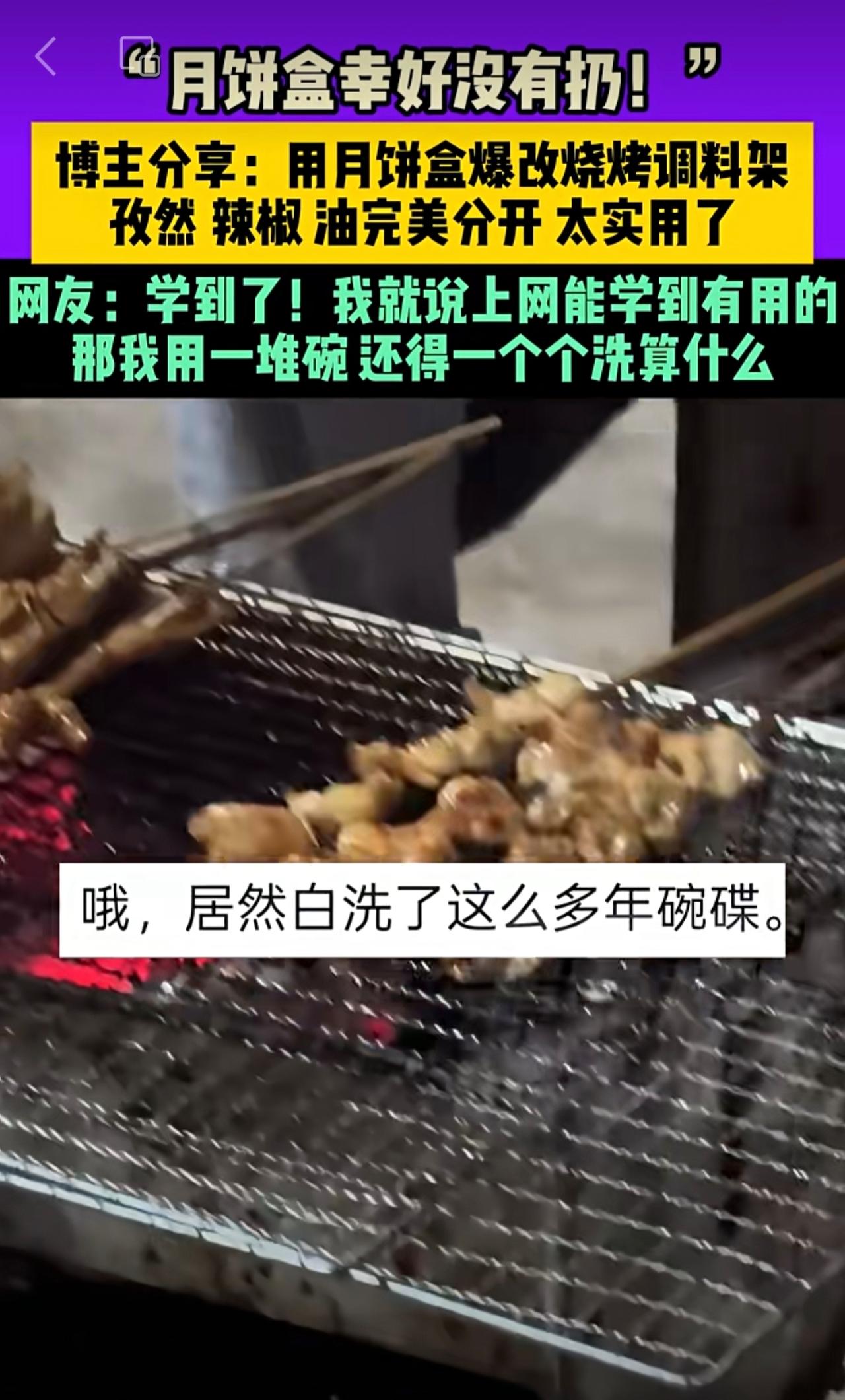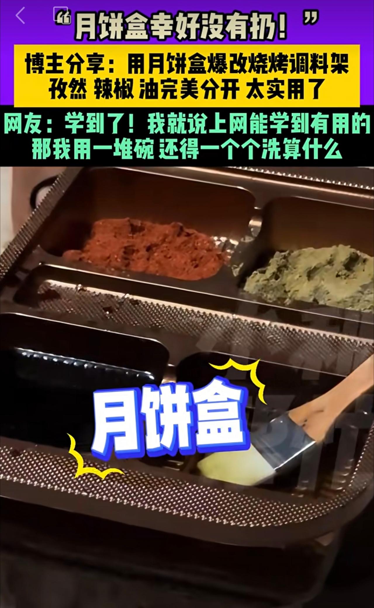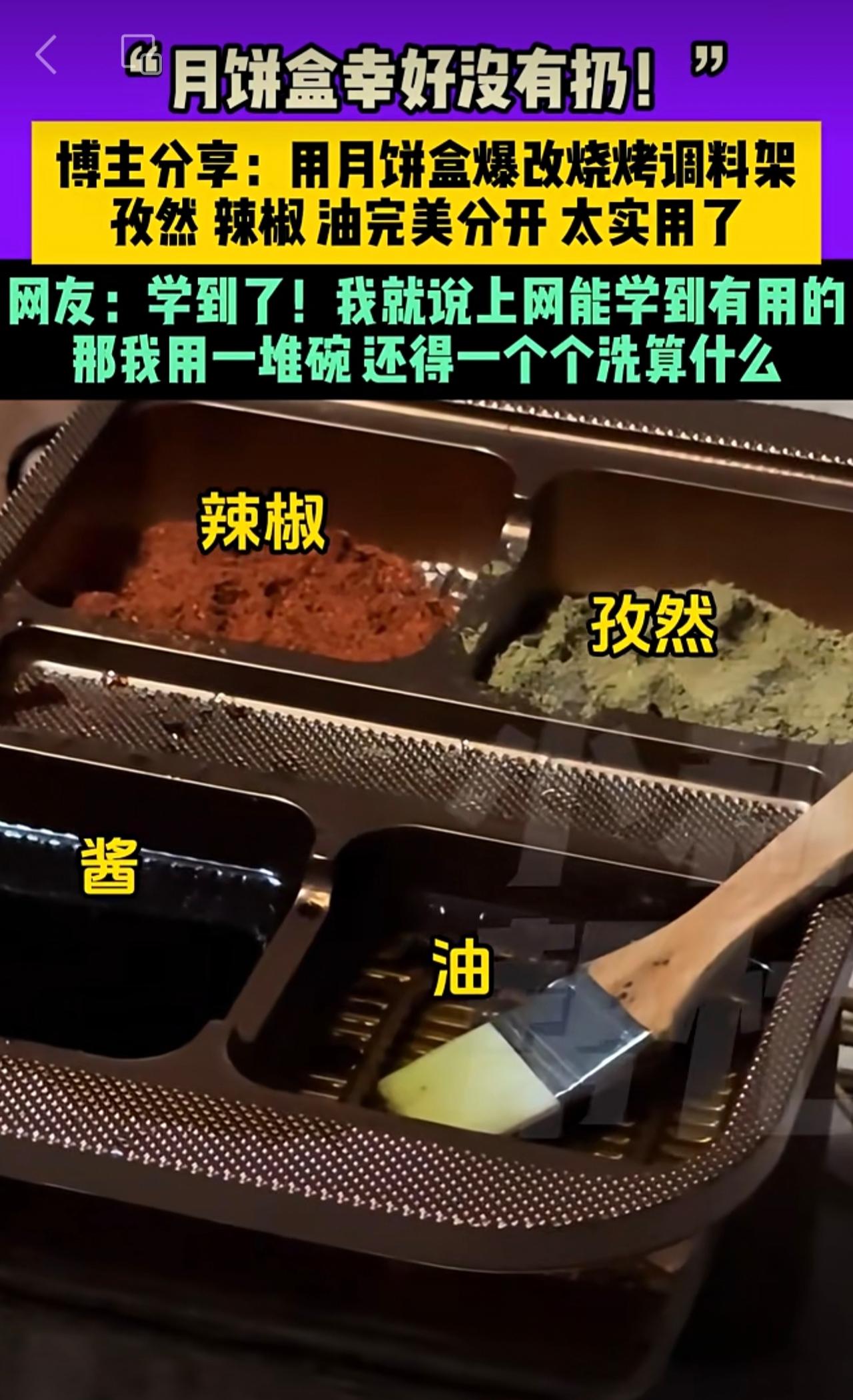 11月1日,广西,“月饼盒幸好没有扔!”博主分享:用月饼盒爆改烧烤调料架,孜然、辣椒、油完美分开,太实用了,网友:学到了!我就说上网能学到有用的,那我用一堆碗,还得一个个洗算什么。
