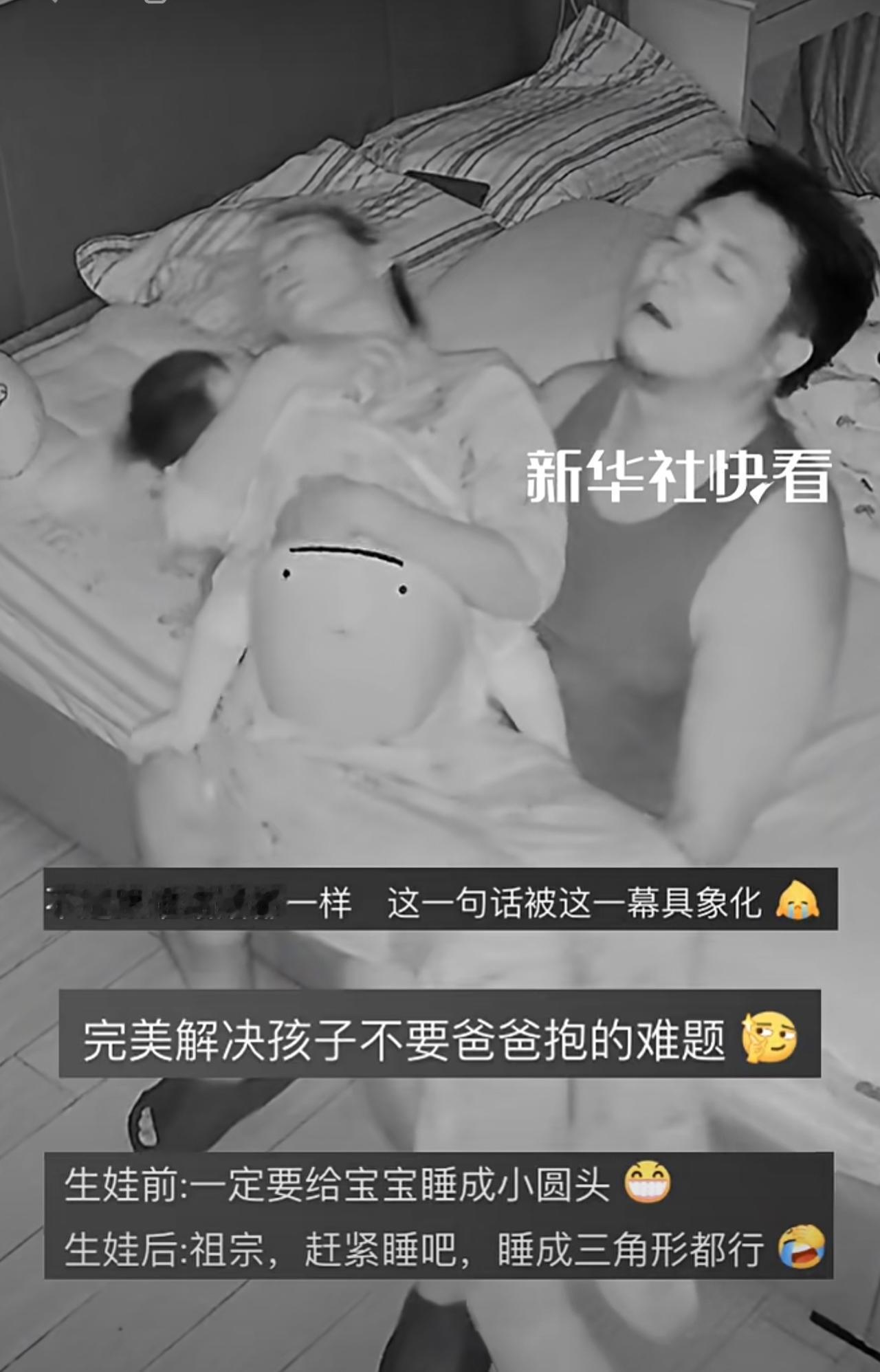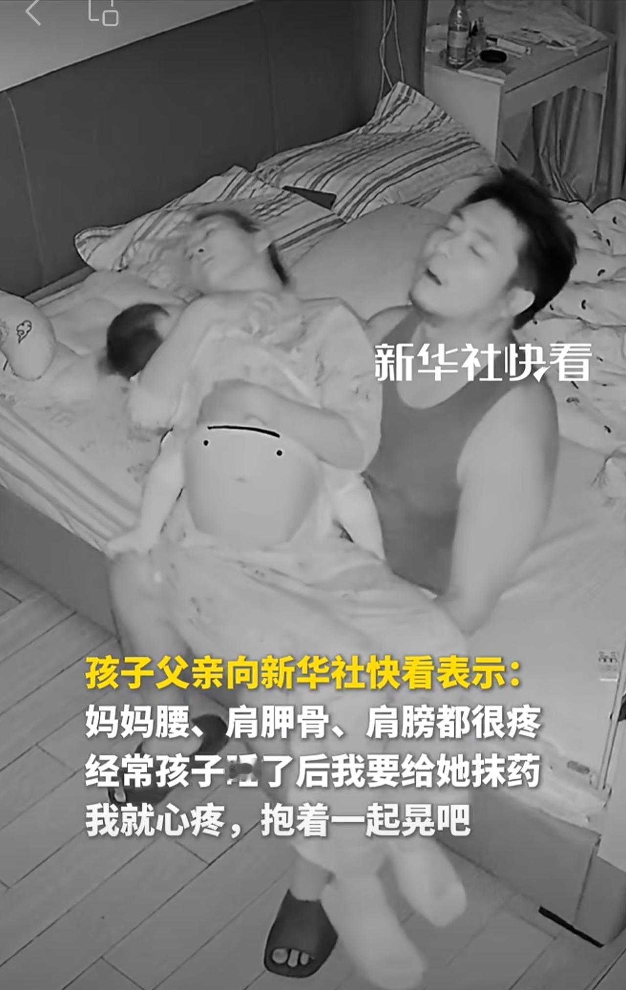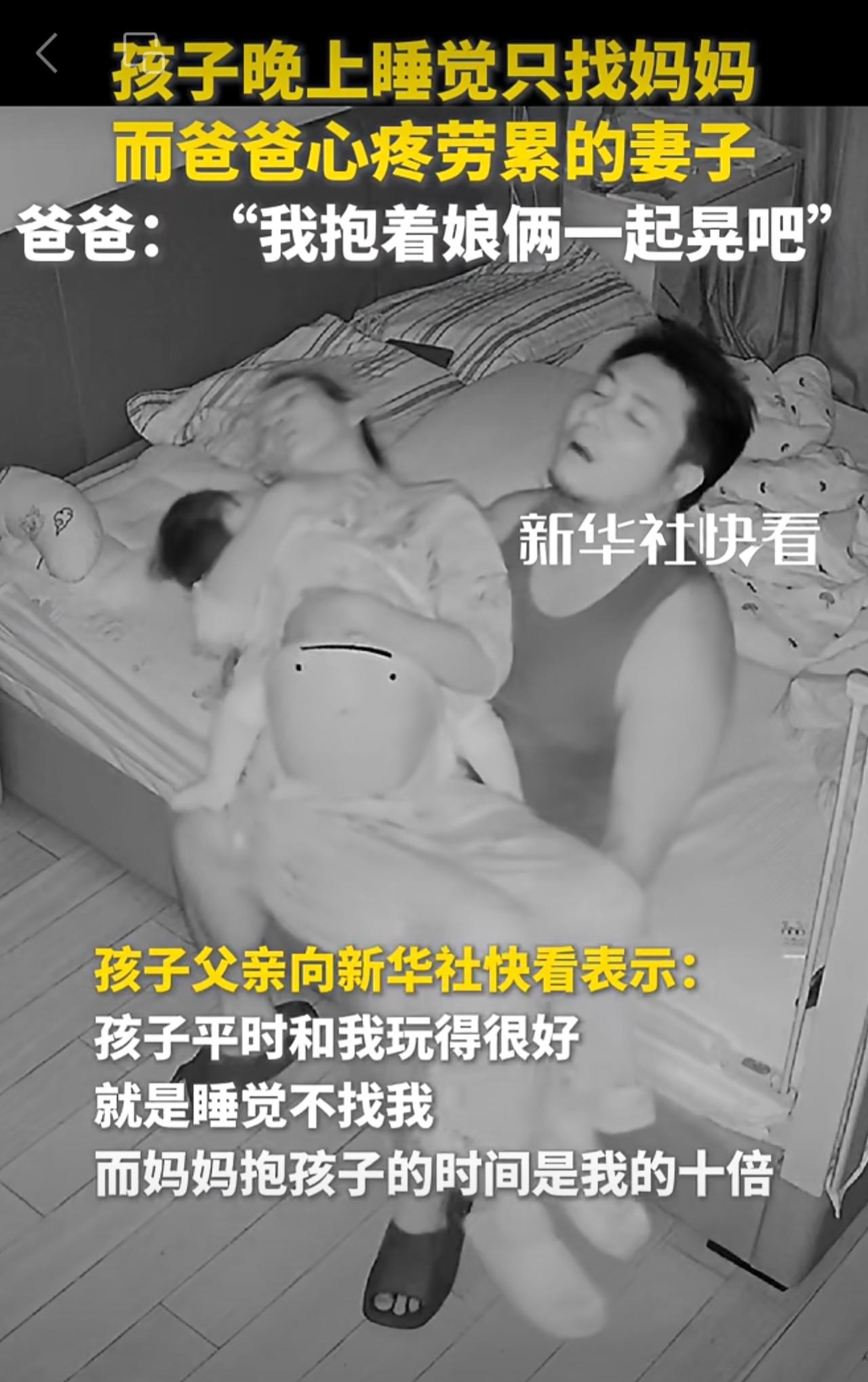 孩子晚上睡觉只找妈妈,而爸爸心疼劳累的妻子,索性主动“抱着娘俩一起晃吧”