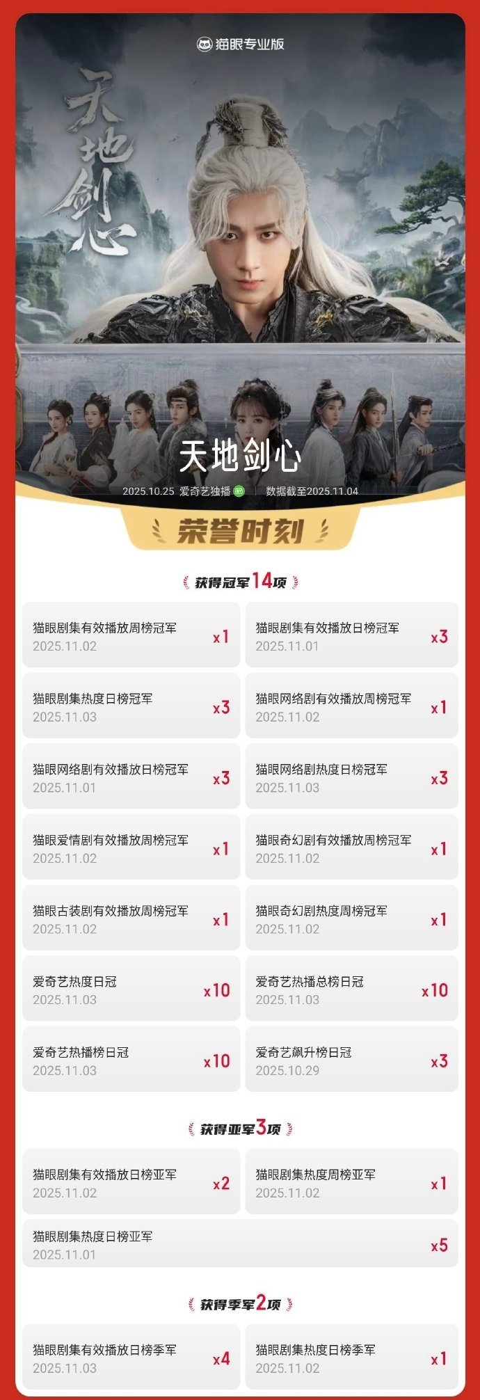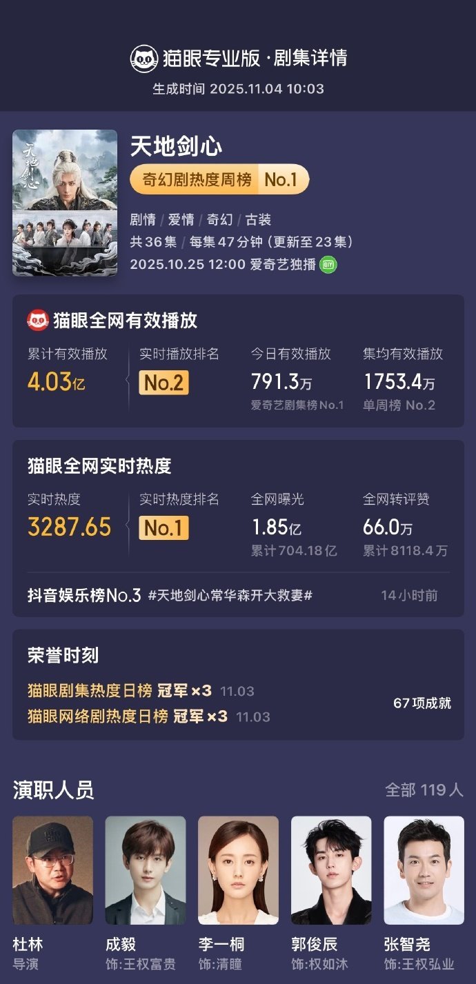成毅天地剑心三次登顶热度榜 天地剑心有效播放已超4.03亿