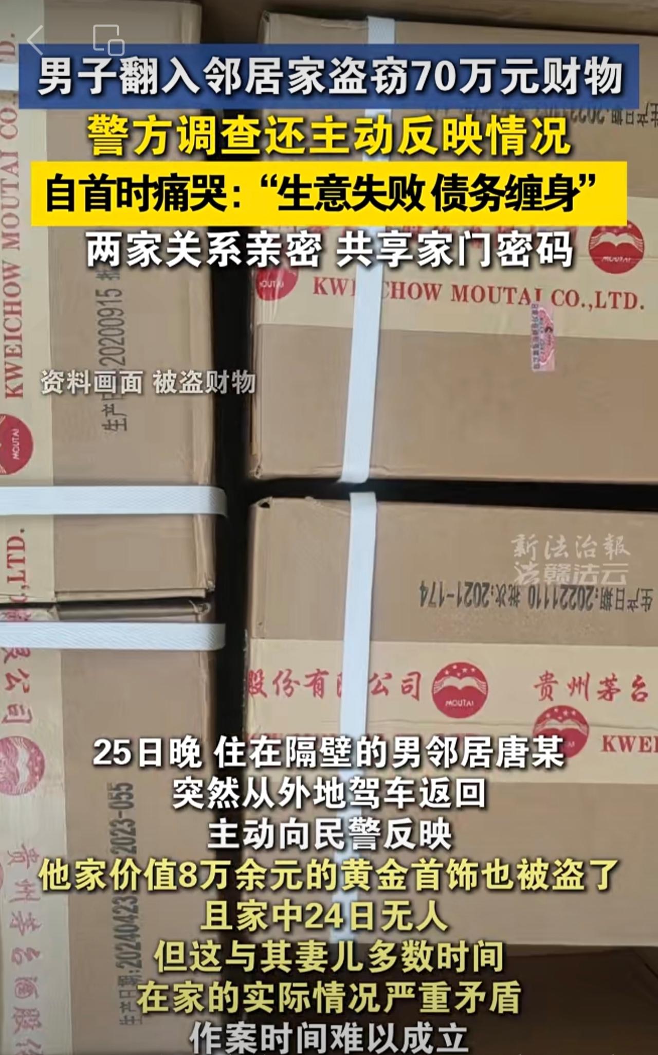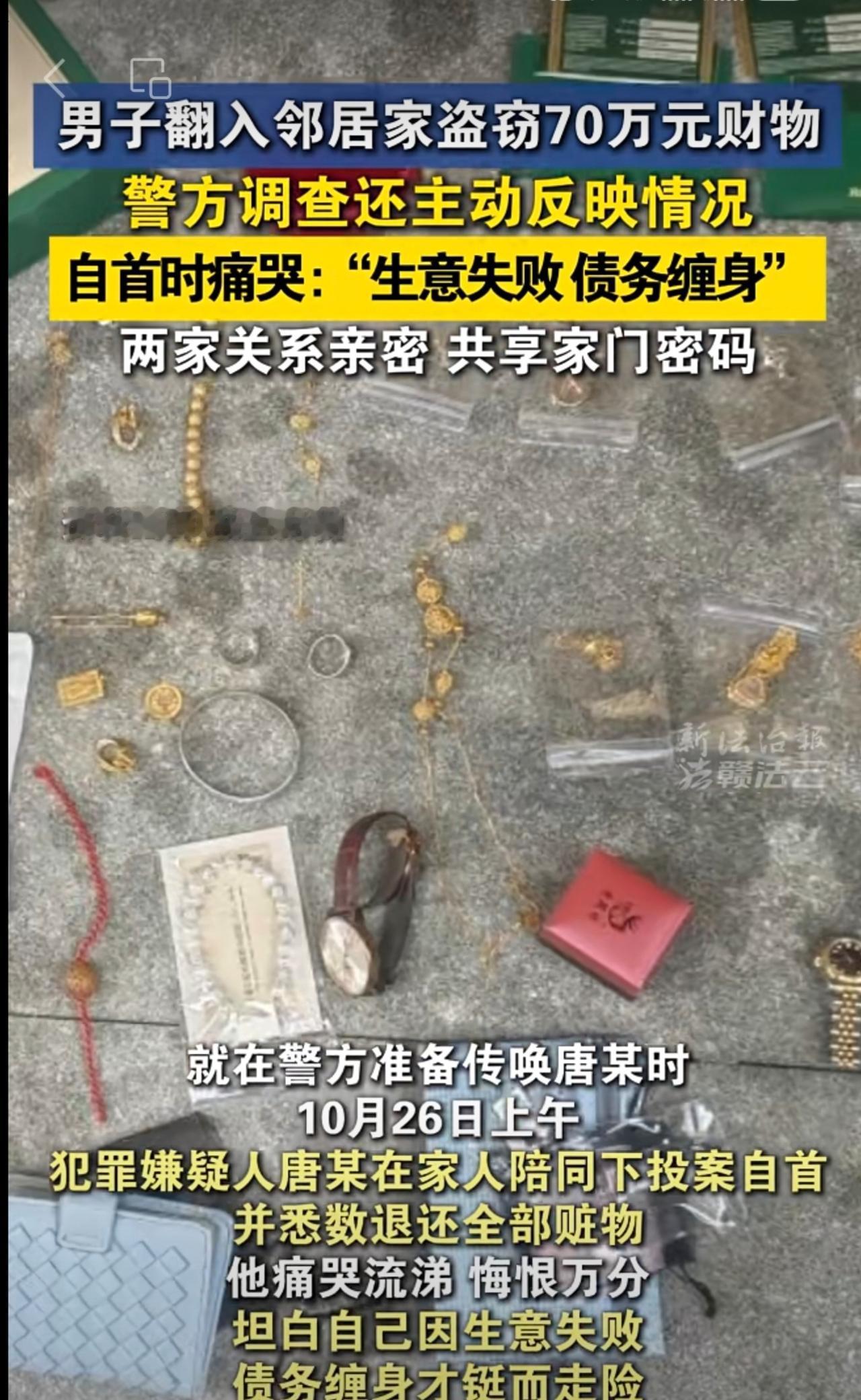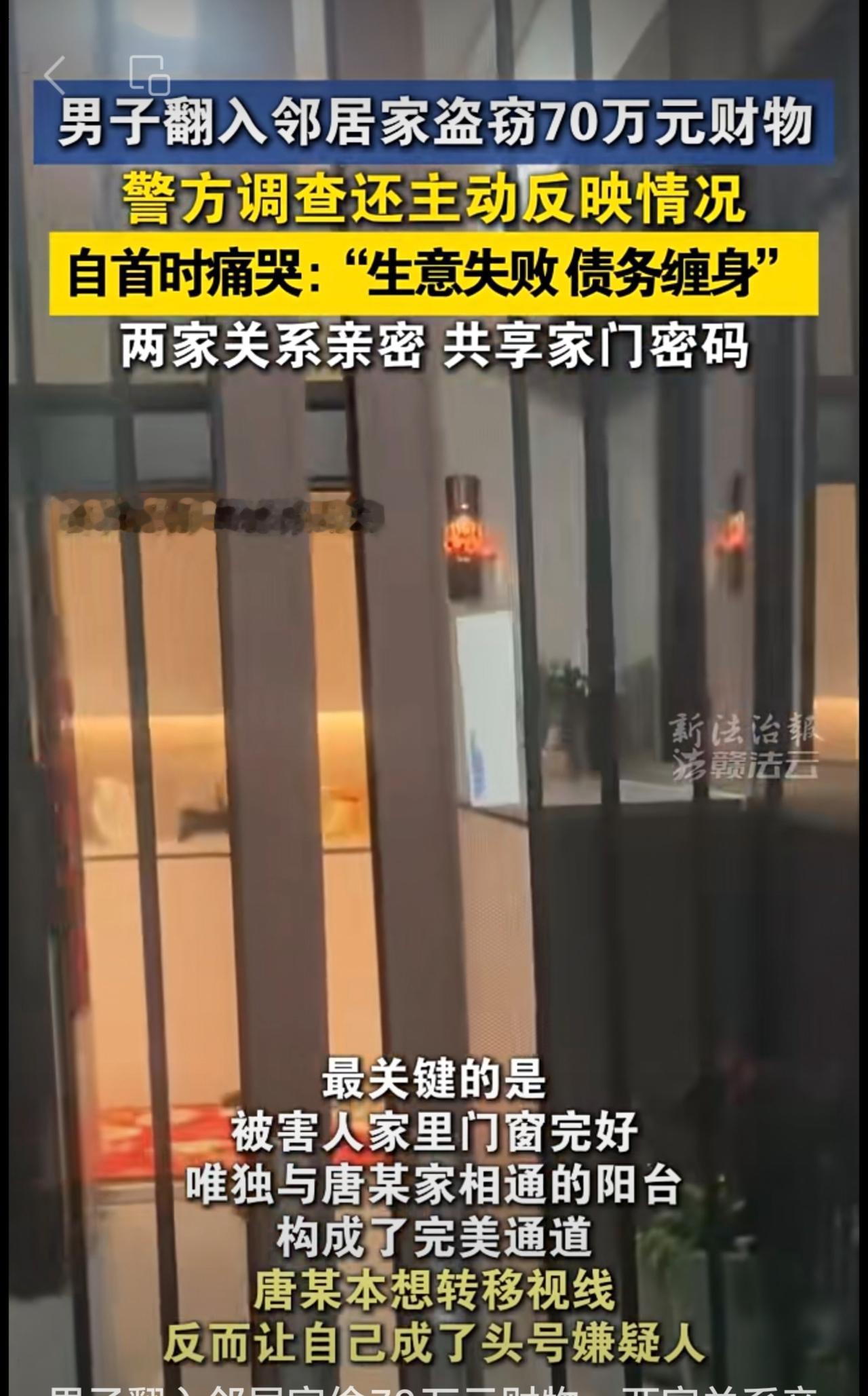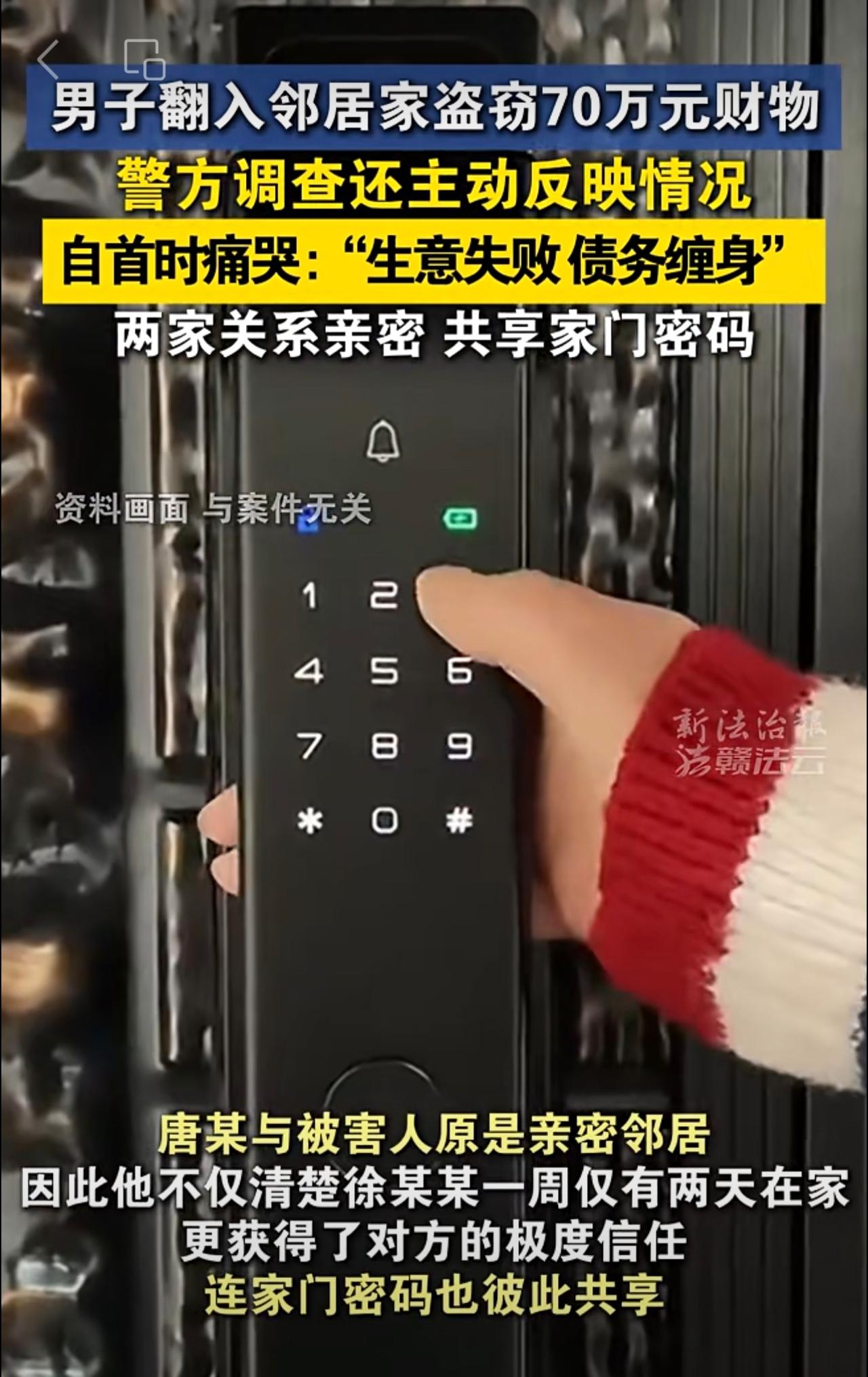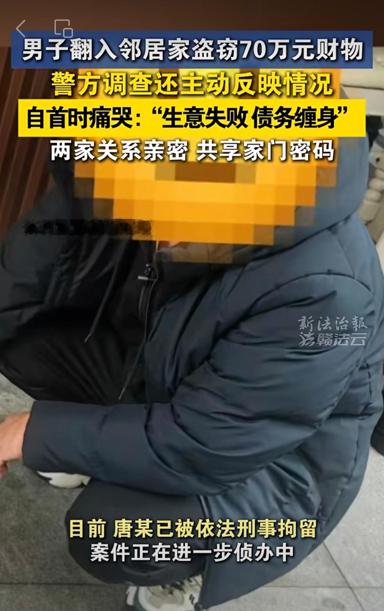 男子翻入邻居家偷70万元财物,两家关系亲密甚至共享家门密码,自首时痛哭:生意失败、债务缠身铤而走险。(来源:新法治报·赣法云客户端 李佳钊)盗窃 邻居 防人之心不可无