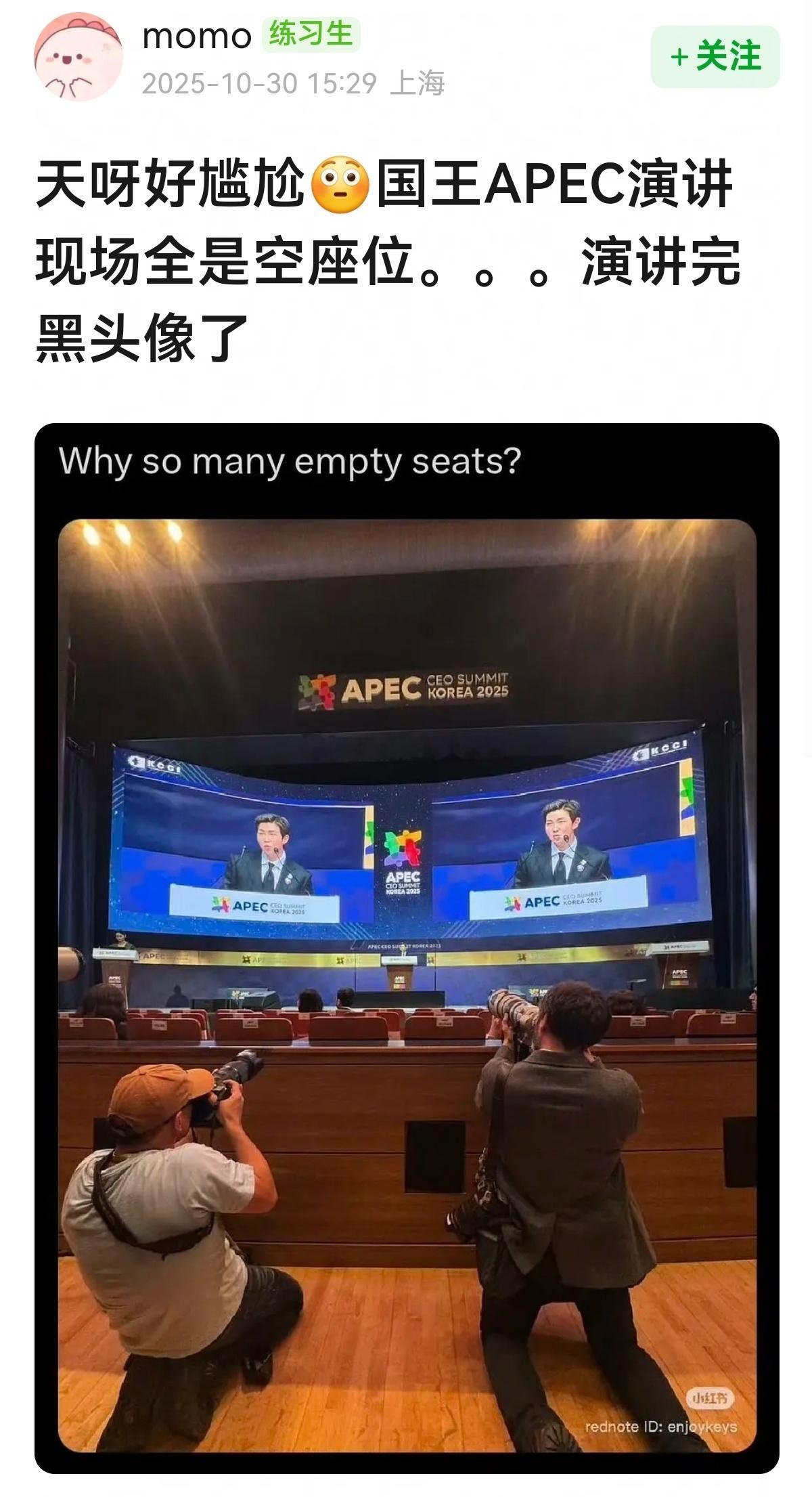 偷国爱豆自费去APEC下辖的一个附属会议去演讲,结果现场座位几乎全空~[吃瓜][吃瓜]