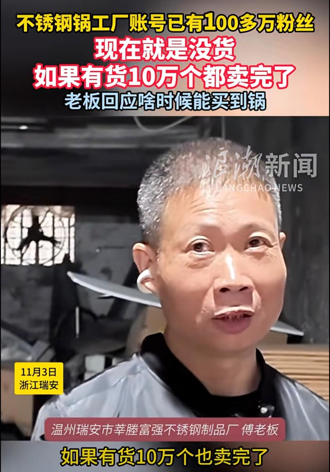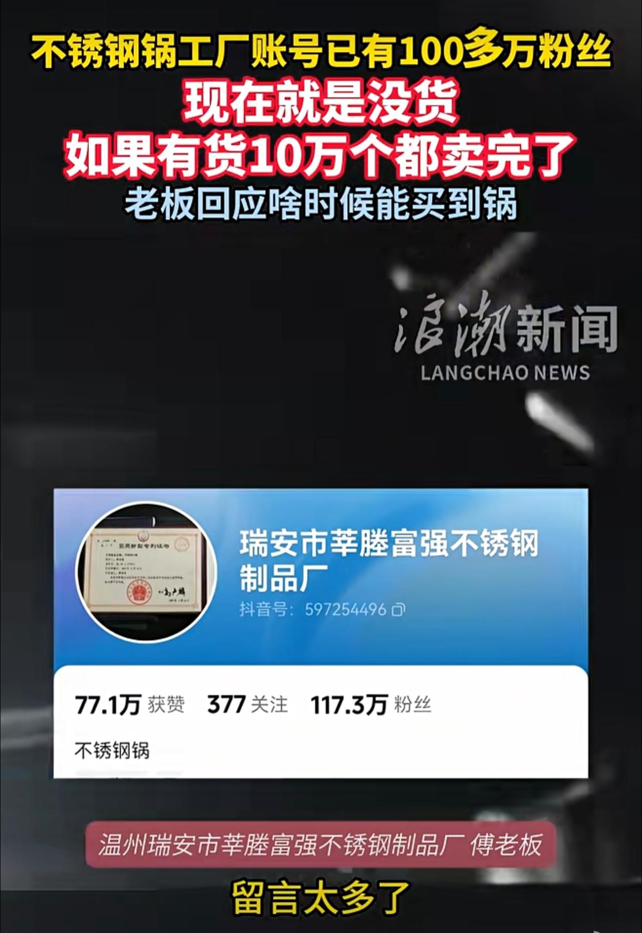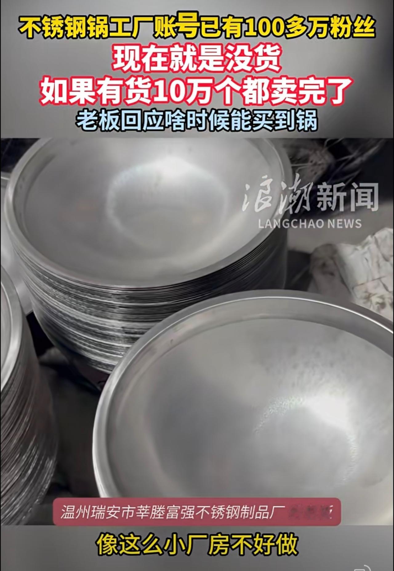 瑞安不锈钢锅工厂账号已有100多万粉丝。老板:现在就是没货,如果有货10万个都卖完了。