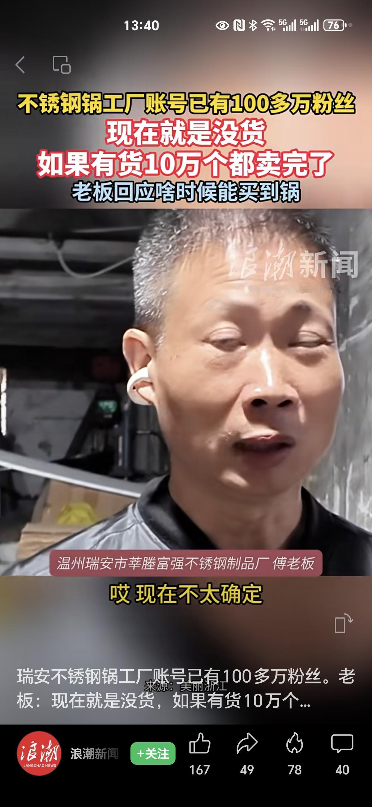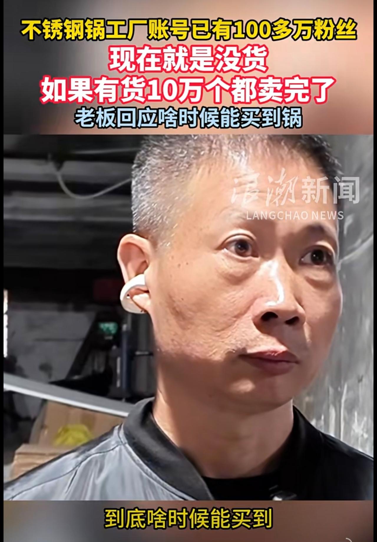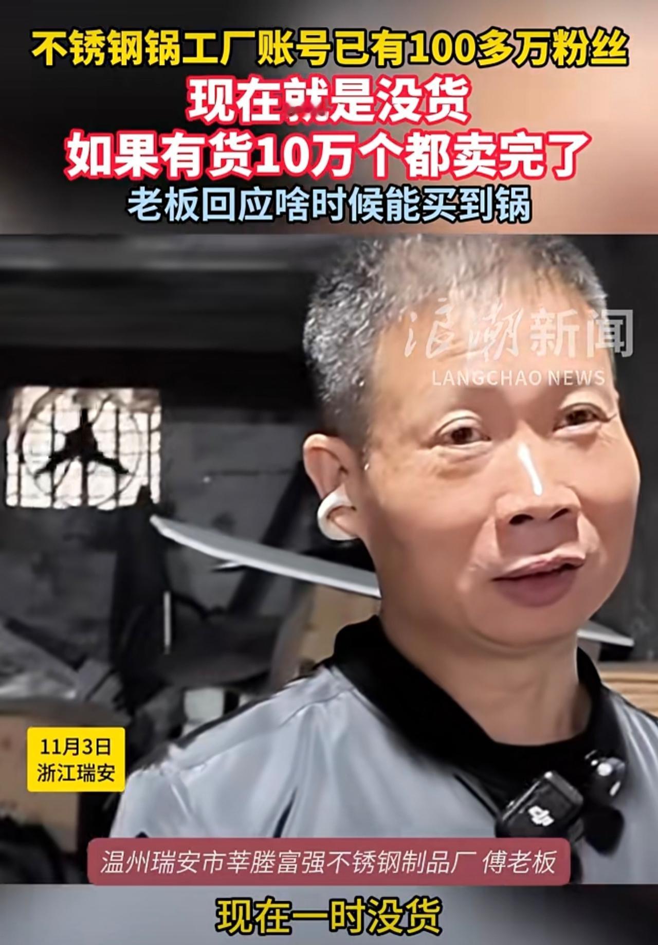 瑞安不锈钢锅工厂账号已有100多万粉丝。老板:现在就是没货,如果有货10万个都卖完了。