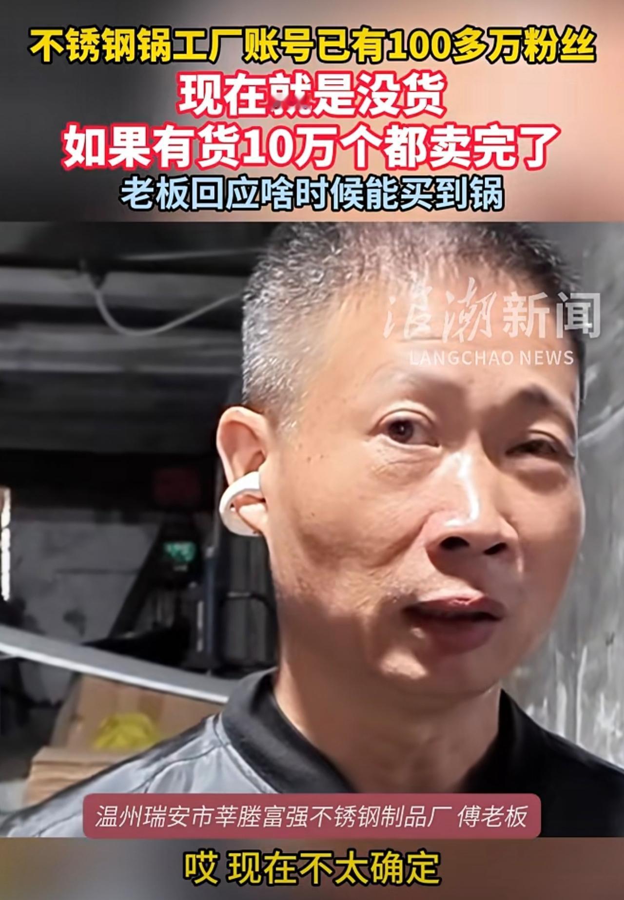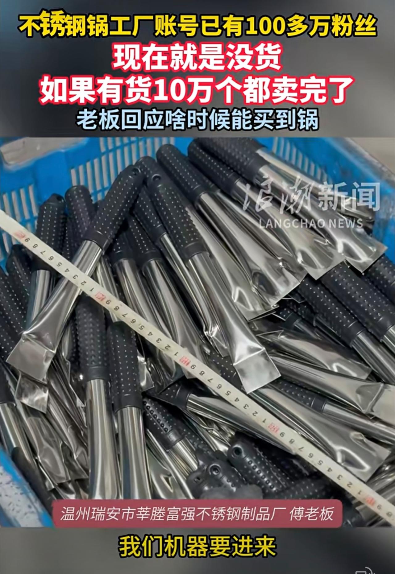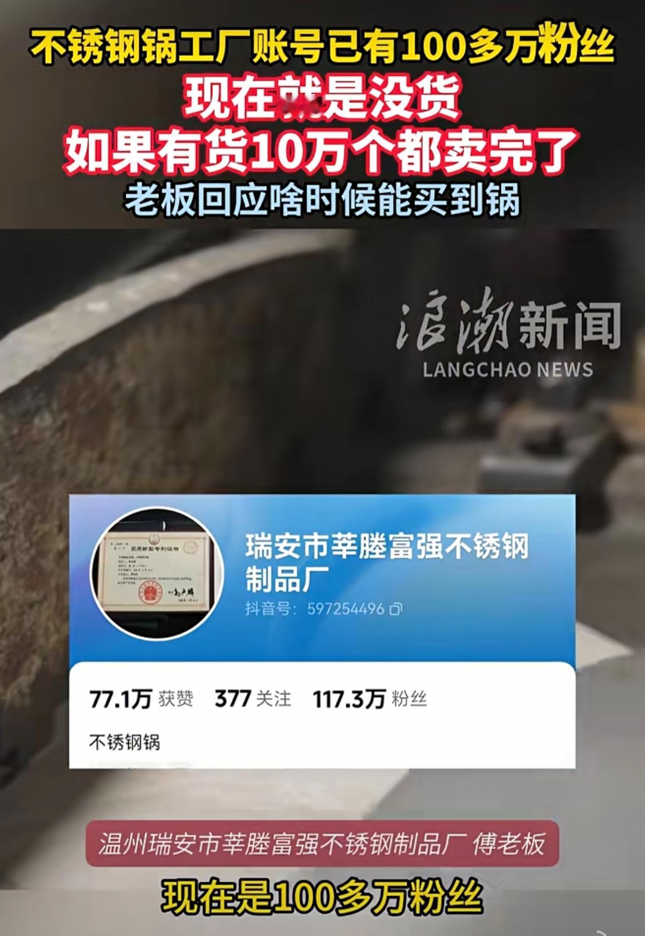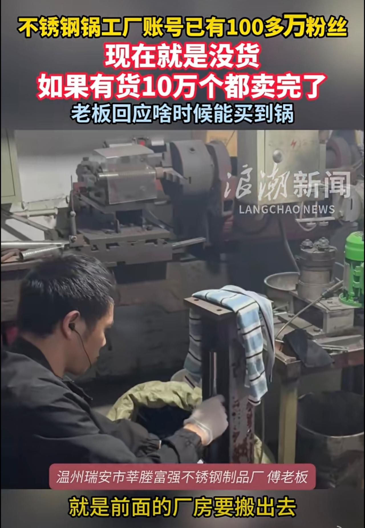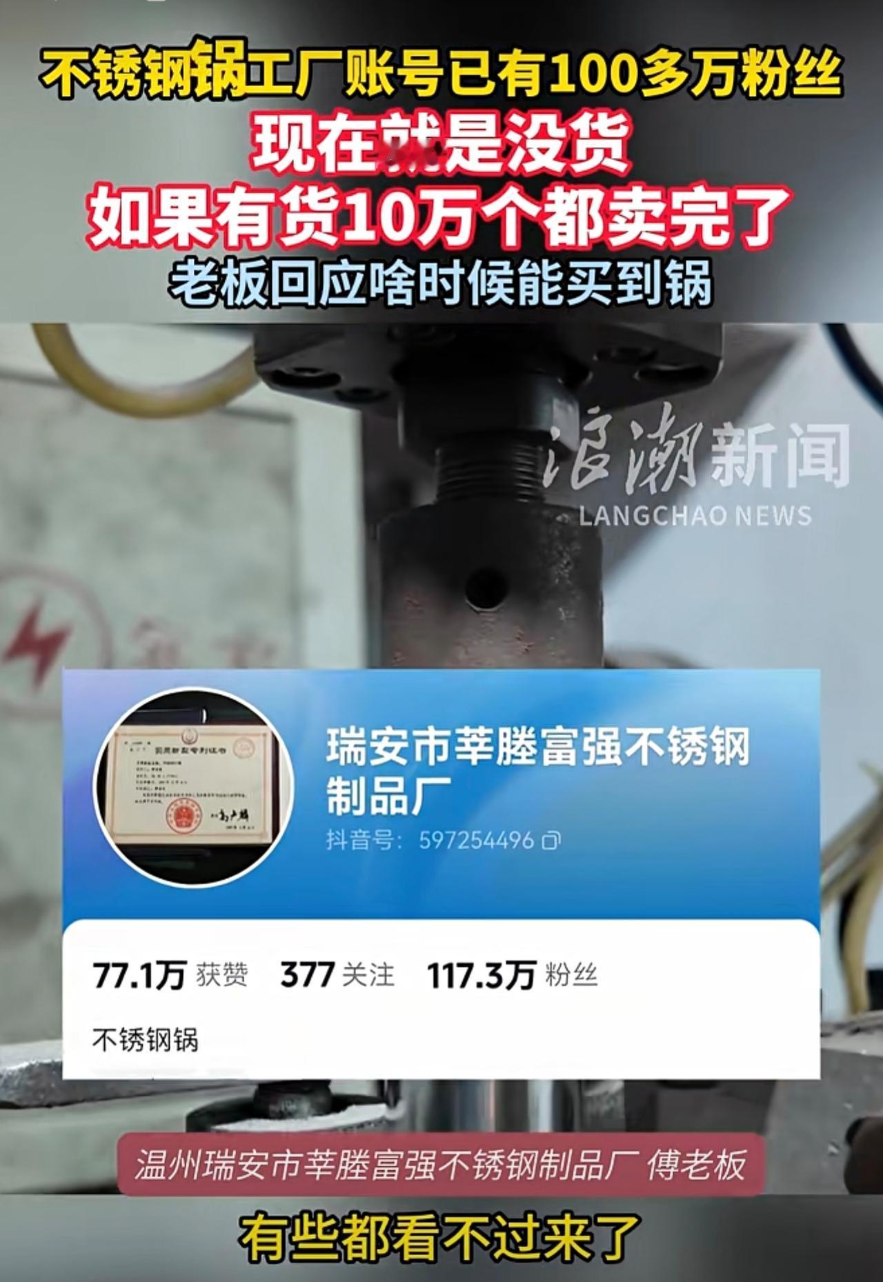 瑞安不锈钢锅工厂账号已有100多万粉丝。老板:现在就是没货,如果有货10万个都卖