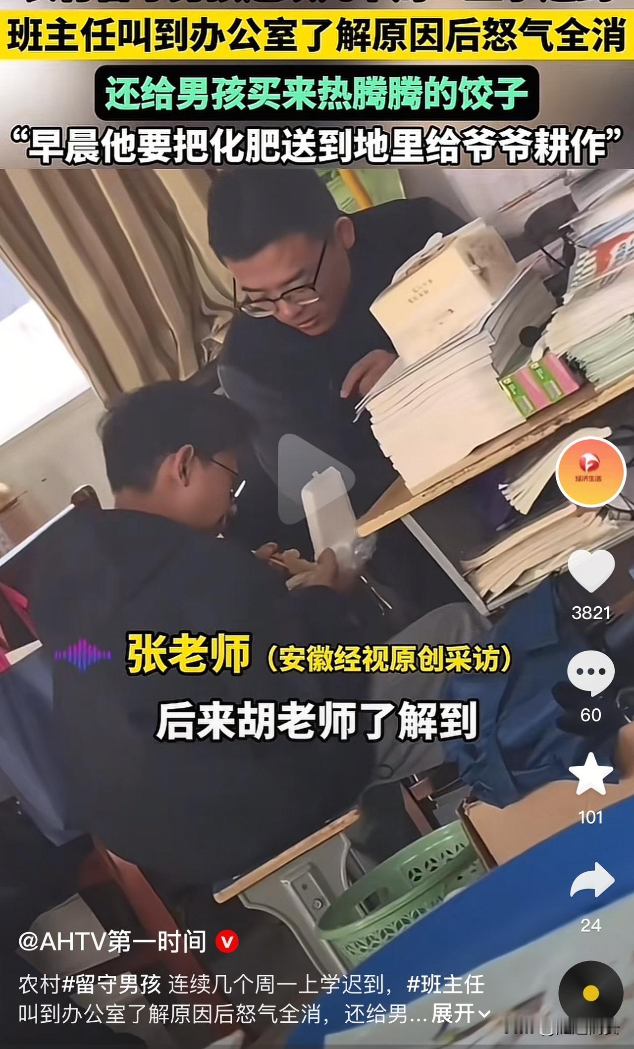 暖到心窝里了!农村留守儿童连续几个周一上学迟到,班主任了解原因后怒气全消,还给他买来了热气腾腾的饺子。 接连几个周一的早晨,小张(化名)都迟到了,这让班主任胡老师非常生气。 昨天,他上学又迟到了,胡老师特意在校门口堵住了他,把他叫到办公室批评了一顿。 小张委屈的说:“家里只有爷爷一个人种地,早晨帮忙往地里送化肥,所以上学才迟到了。” 胡老师看着眼前低头认错的小张,心里一颤,他记得他父母都在外地打工,平时跟爷爷一起生活,他爷爷岁数也很大了,如果不帮忙,老人家也非常辛苦。 后来了解到小张还没有吃早饭,他就到街上买了热气腾腾的饺子给他吃。 看着小张大口大口的吃着饺子,真是让我太感动了! 师者如光,微以致远! 这样的老师不仅能传授知识,更能点燃孩子的热情、塑造品格,甚至影响孩子一生的方向! 其实,好的老师会在孩子心里留下一束光,就算长大成年,每每想起就觉得很温暖! 记得我上小学3年级的时候,父母探望病重的姥爷,奶奶到镇上赶集没有回家,数学老师知道我饿着肚子后,特意把我叫到她家,给我煮了一碗带有荷包蛋的面条,直到现在我都记得那个味道,也记得那个特别有爱的老师。