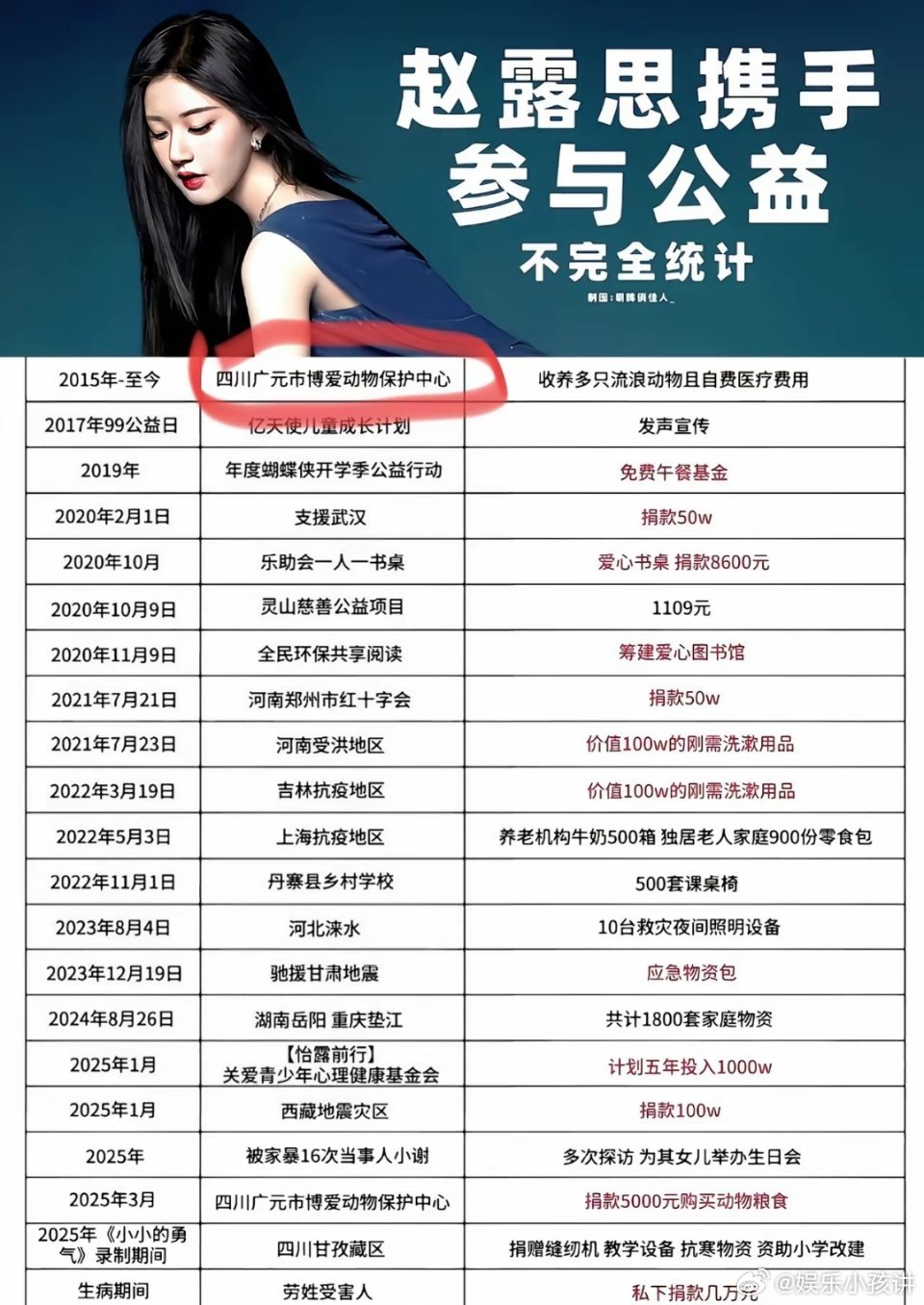 她说她的家乡是一个百分之99的人都不知道的地方,有一个账号叫做:广元市博爱动物保护中心,赵露思每个月给他们捐助5000元,这件事情她不是做了一年,而是整整十年!
