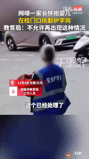 云南红河一所学校门口,一位家长抱着婴儿站在门口执勤,只见她穿着安全护学的制服,既要哄着怀里的婴儿,也要时刻注意门口的车流,对此当地教育局表示,学校老师曾经劝阻过,但这位家长坚持要去执勤,这是学校的失误,今后会严格要求,确保不再出现类似情况。 网友看完这一幕,都觉得这年头当家长真是太不容易了,虽然是孩子上学,但家长显然更加辛苦,不仅要在外挣钱,还要照顾家里,现在连学校都给家长安排了一份工作,这对于那些家里有二胎三胎的家长来说,无疑是火上浇油的做法,尽管老师劝阻过这位家长,但试想一下,如果她没有去执勤,那孩子会不会被区别对待呢,所以她宁愿抱着婴儿去执勤,也不愿放弃,这就是当家长的无奈吧,可见这种规定必须好好整改了!大家怎么看呢?