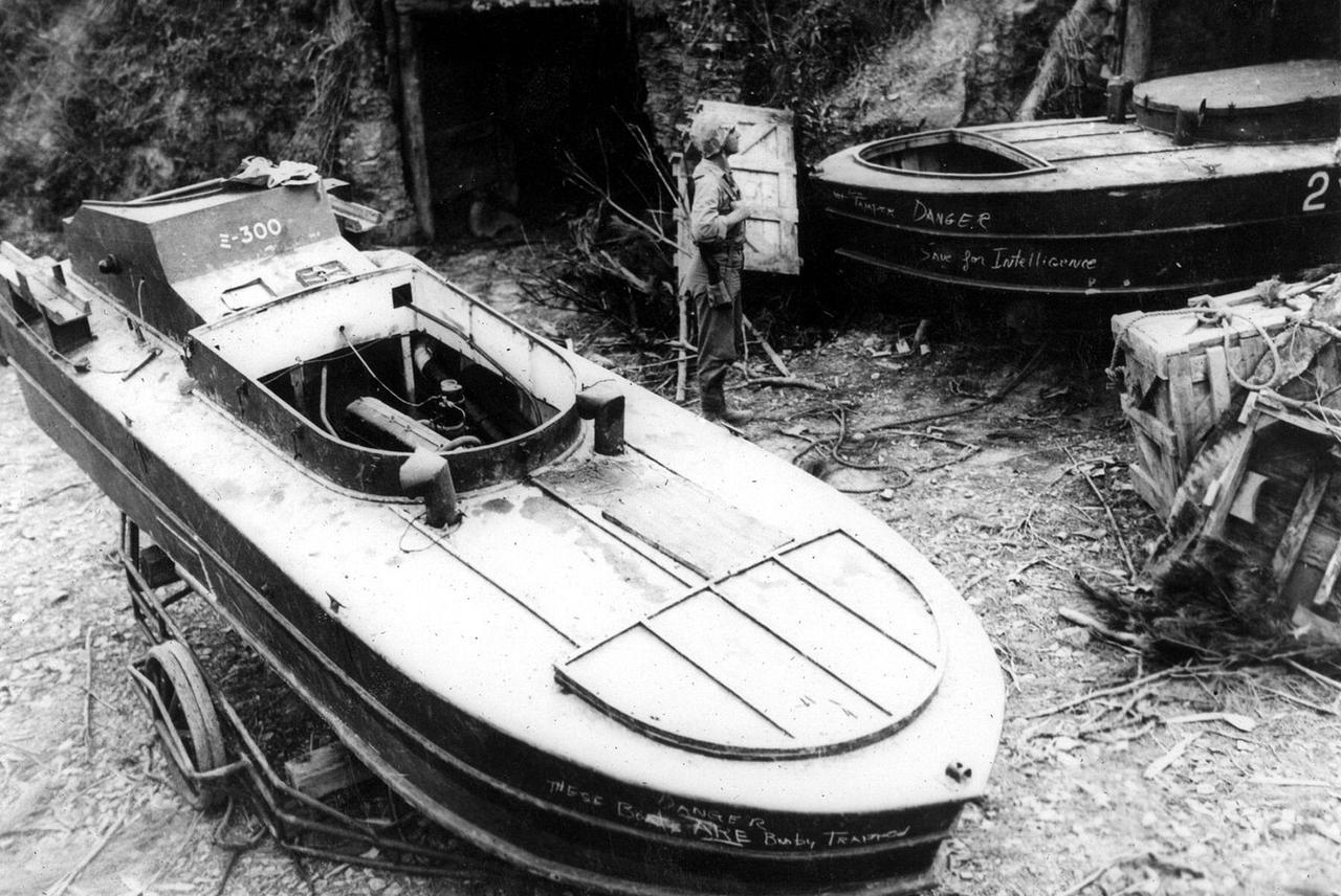 1945年,一名美军士兵在冲绳岛观看堆积如山的缴获的日军“震洋”式一号型特攻艇。 “震洋特攻艇”是日本海军在二战末期建造的自杀攻击快艇,乘员1-2人,艇艏装载250公斤炸药,通过撞击敌舰引爆炸药。虽然造价低廉,但“震洋”艇的艇员训练是相当严格的。不过,“震洋”的建造数量高达6000艘以上,但基本上未能用于实战。