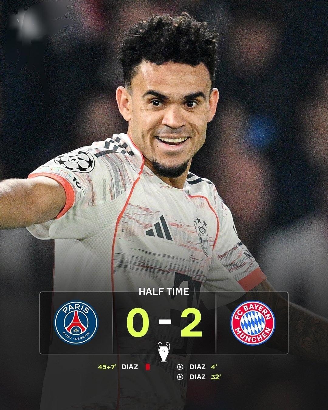 巴黎圣日耳曼1比2拜仁慕尼黑迪亚斯梅开二度迪亚斯红牌