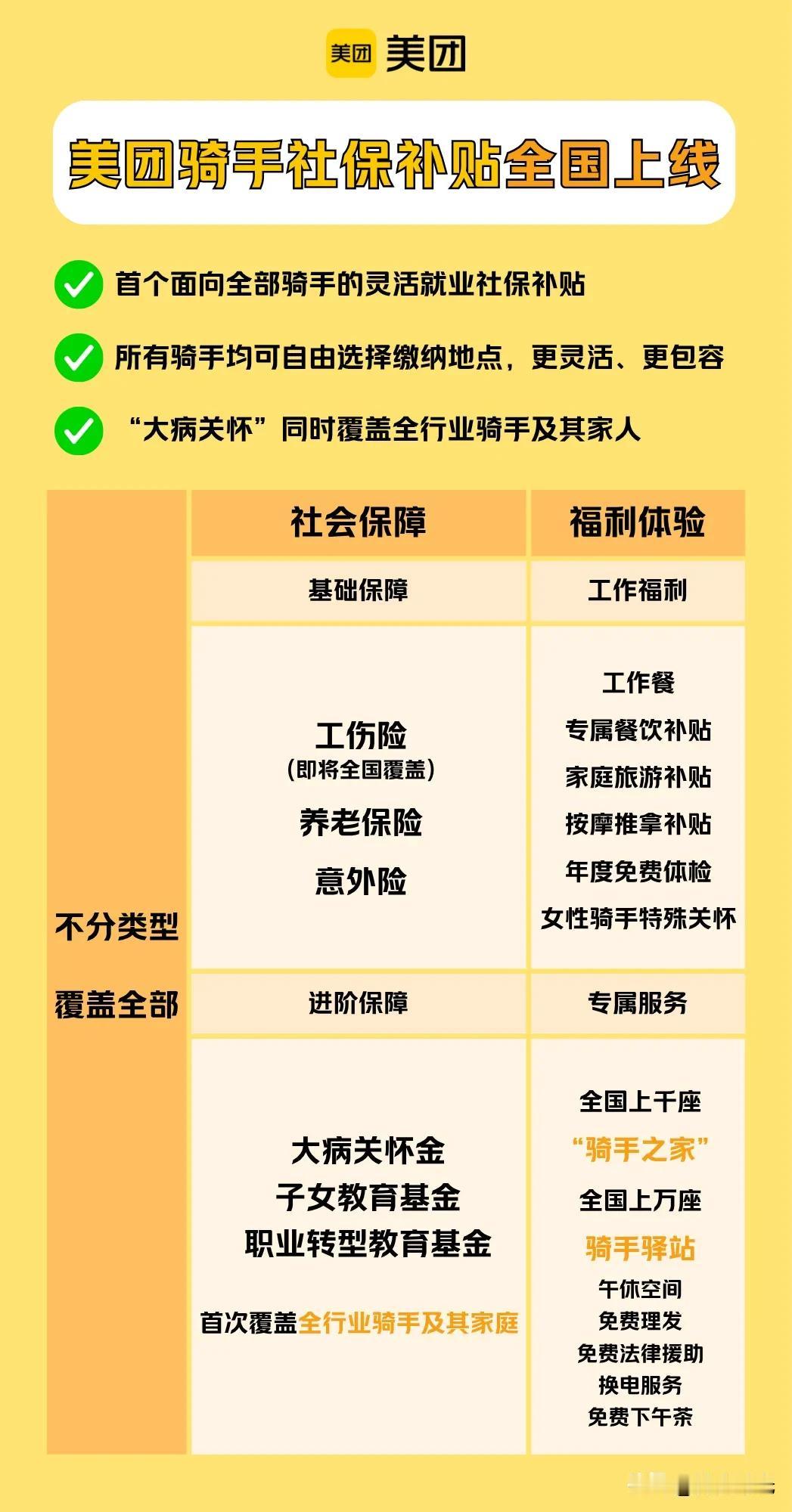 2月19日港股收盘后,美团宣布要给全国全职及稳定兼职骑手交社保,预计2025年二季度实施。这就像给骑手们送上了一份超贴心的“保障大礼包”,是完善骑手保障的又一好举措。 早在2022年7月,美团就开启为新就业群体缴新型职业伤害保费的行动,已豪掷14亿给7个试点省市骑手买保障,后续还会让所有省市骑手都能享受。开年以来,美团动作频出,取消超时扣款、上线防疲劳机制,还建了1.6万个骑手社区。给骑手交社保,既维护了劳动者利益,也为行业长远发展添砖加瓦,能打造一支稳定专业的配送“铁军”。期待美团后续更多保障福利。