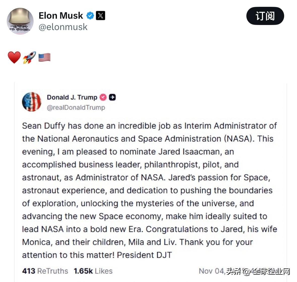 特朗普提名艾萨克曼为NASA局长,马斯克兴奋转发 “肖恩·达菲作为美国国家航空航天局(NASA)的临时局长,工作出色。今晚,我很高兴提名贾里德·艾萨克曼担任 NASA 局长。贾里德是一位杰出的企业家、慈善家、飞行员和宇航员,他对太空的热爱、宇航员的经历以及致力于探索边界、揭开宇宙奥秘和推动新太空经济的决心,使他成为领导 NASA 迈入一个大胆新时代的理想人选。恭喜贾里德、他的妻子莫妮卡以及他们的孩子米拉和利夫。感谢大家对此事的关注!特朗普总统”