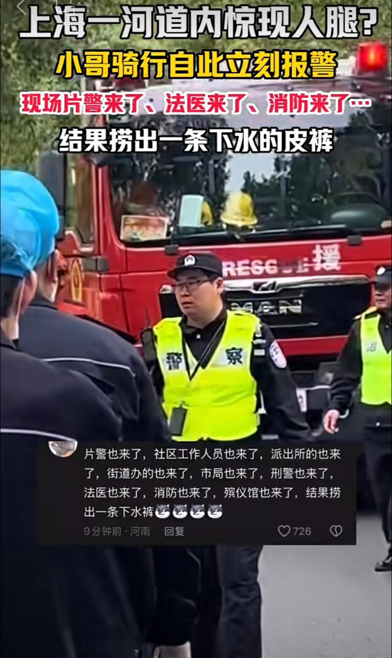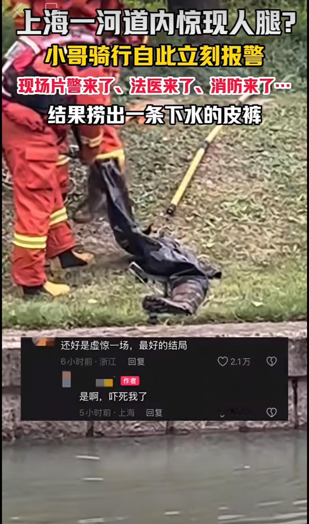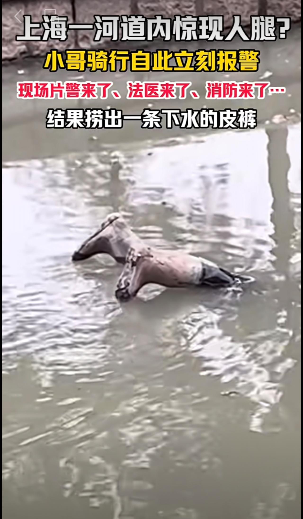 11月4日(发布),上海。上海一河道内惊现人腿?小哥骑行自此立刻报警,现场片警来了、法医来了、消防来了…结果捞出一条下水的皮裤。(编辑:昊昊)