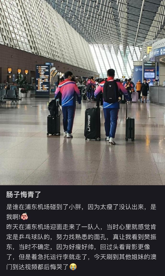 有球迷昨天在浦东机场偶遇了乒乓球队,但是因为樊振东瘦了,没有认出背影,表示肠子都悔青了。咚咚真的瘦了好多啊,备战辛苦了!加油