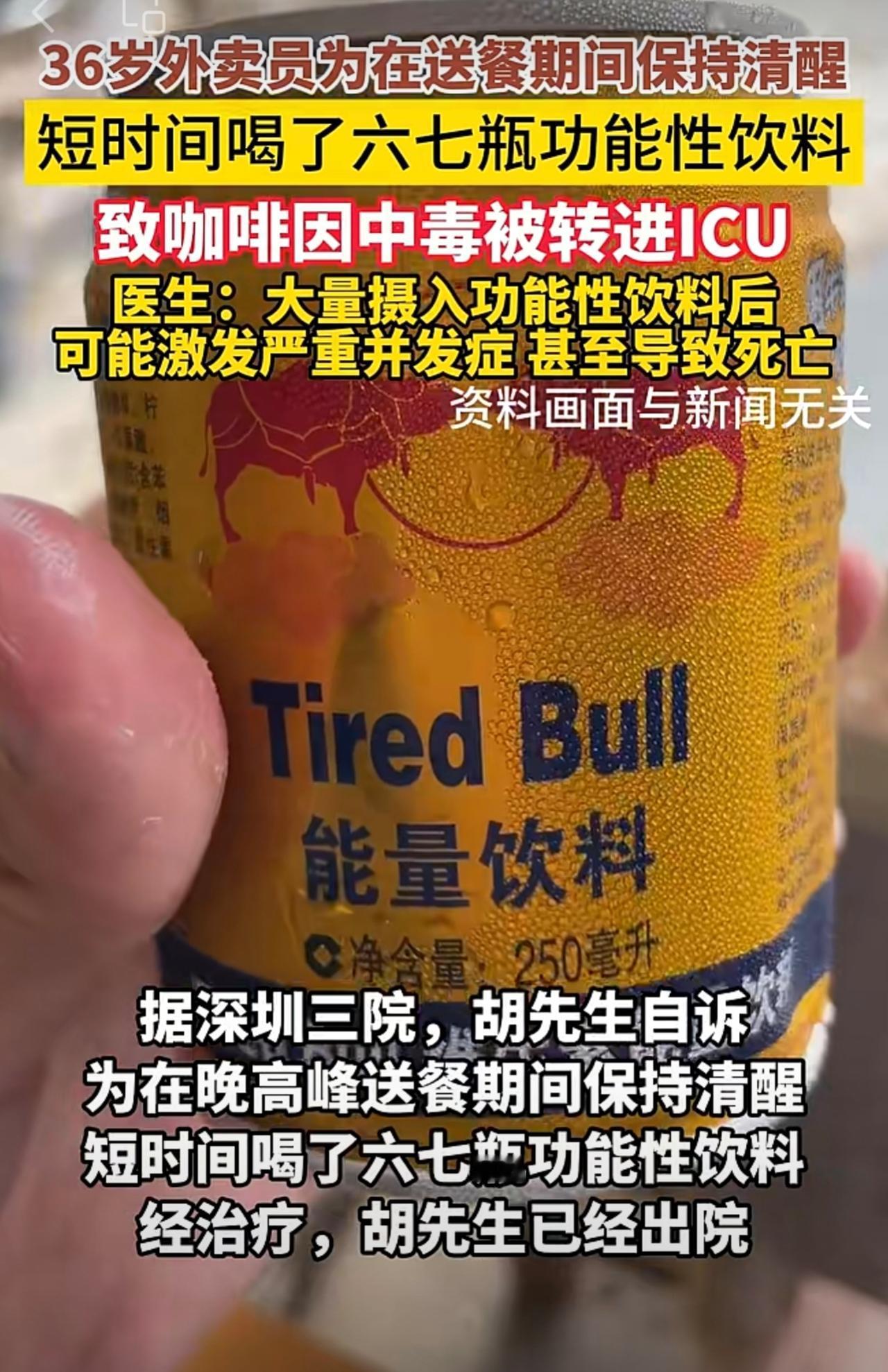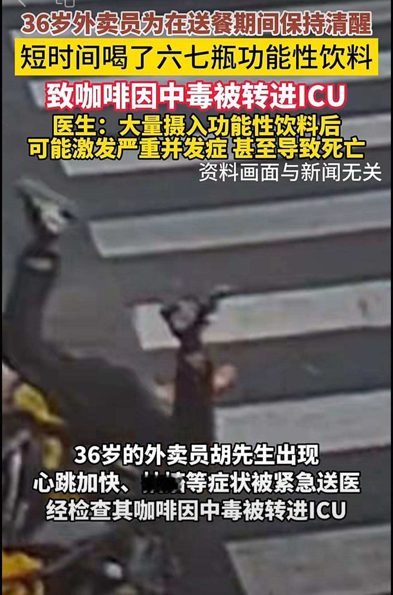 36岁外卖员为在晚高峰送餐期间保持清醒,短时间喝了六七瓶功能性饮料致咖啡因中毒被转进ICU。(纵览新闻)