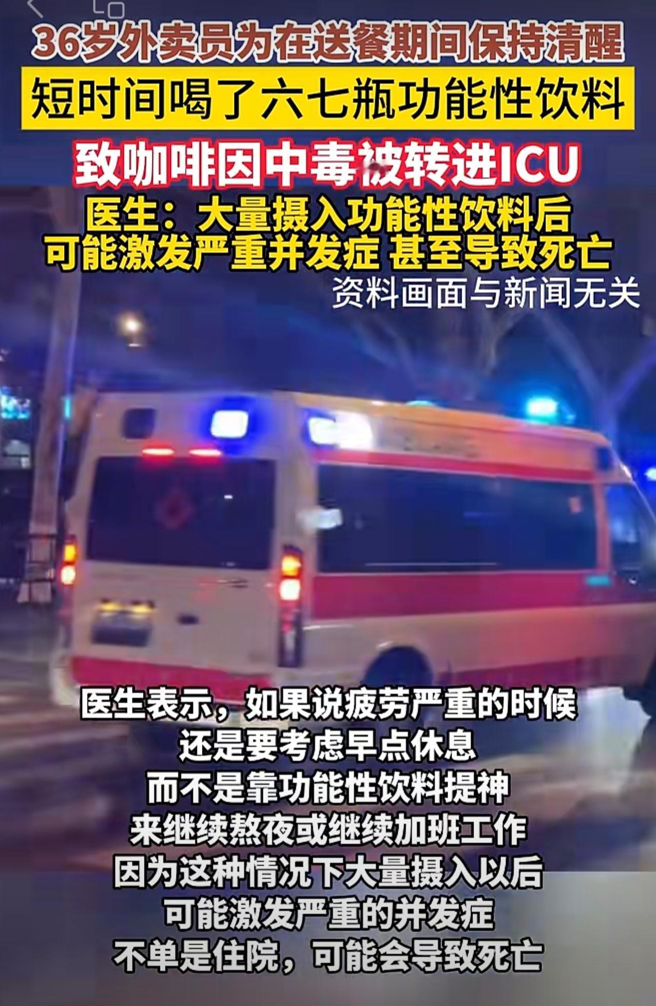 36岁外卖员为在晚高峰送餐期间保持清醒,短时间喝了六七瓶功能性饮料致咖啡因中毒被
