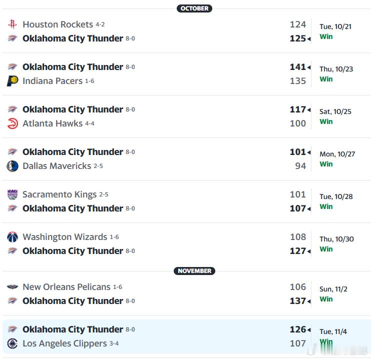 雷霆开赛至今8战全胜,队史最佳开局。这还是没有J-dub的情况下。雷霆开季八连胜