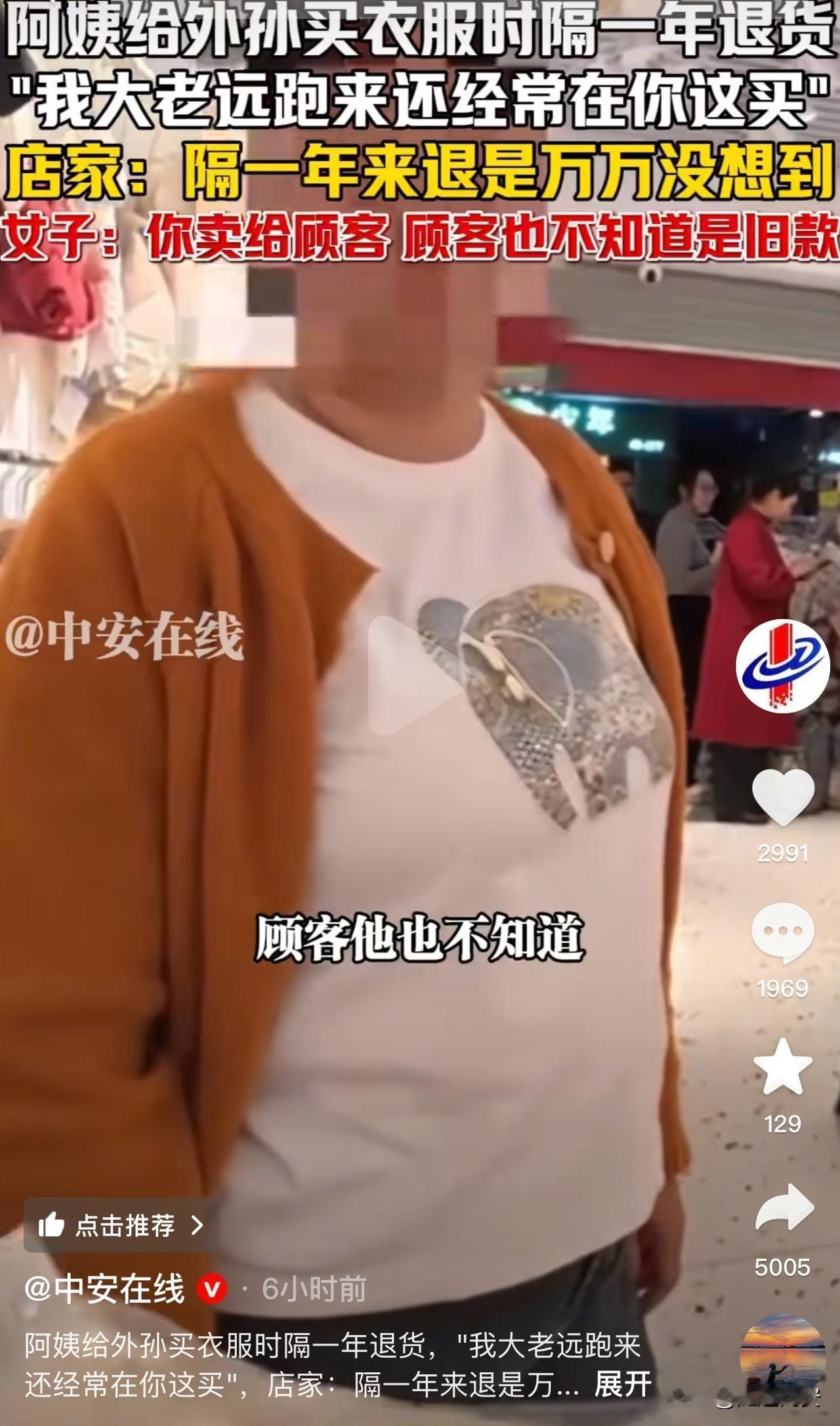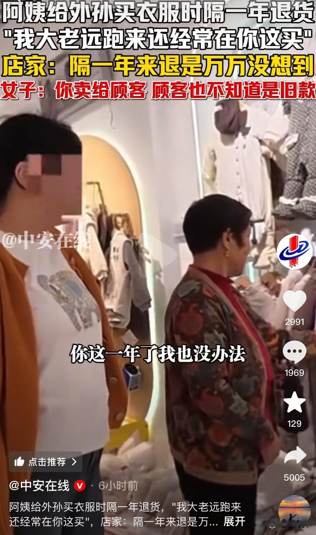 万万没想到!河南一老人去年给外孙买的衣服,今年发现穿不上了,她拿着衣服直接找店家来退货,老板无奈的说:“这都一年了,我也没办法了。”谁承想,孩子妈妈更是语出狂言…… 11月4日,服装店老板刚刚开门,店里就来了两个“不同寻常”的顾客。 老人拿着衣服跟老板说,她去年在店里给外孙的衣服,今年拿出来发现都小了…… 老板一听就明白是怎么回事,笑着跟她说,去年没办法了,阿姨。 老人赶紧解释是去年九十月买的,言外之意退给你,你卖给别人还能接着穿。 跟老人一起来的孩子妈妈,也站出来跟老板解释,今天早晨拿出来给孩子穿的时候,才发现衣服小了…… 店家也是耐心的给他们解释:现在屋里全部都是今年的新款,没有一件去年的衣服,如果是三五天前、一周前、甚至是一个月前都可以给调货,你这都买一年了,我也没办法了,理解一下吧! 结果,孩子妈妈更是语出狂言,让人觉得真是林子大了什么鸟都有。 只见她轻飘飘的对店家说:“咱不说这个是去年换的旧货,顾客他也不知道啊!” 店家:“……” 这件事也在网络上引起轩然大波,有网友说自己婆婆前两年做的棉绸裙子,洗缩水了,今年还去找店家。 也有网友称,你敢换,第二天到处都流传着某某服装店的衣服都是二手。 去年买的衣服今年来退,这一家人真是够奇葩。 买的衣服小了,可以送给亲戚朋友家的孩子穿,或者把衣服捐给有需要的人;时隔一年才退货,这不是没事找事吗? 老年人岁数大了,想倚老卖老,那么孩子妈妈很年轻,怎么也跟着胡来呢,也这么不讲武德呢,人家店里都是最新款的衣服,去年的让人家怎么卖?还建议店家不讲诚信,看来她们的目的不光是退货,更想让服装店倒闭。 大家觉得呢?