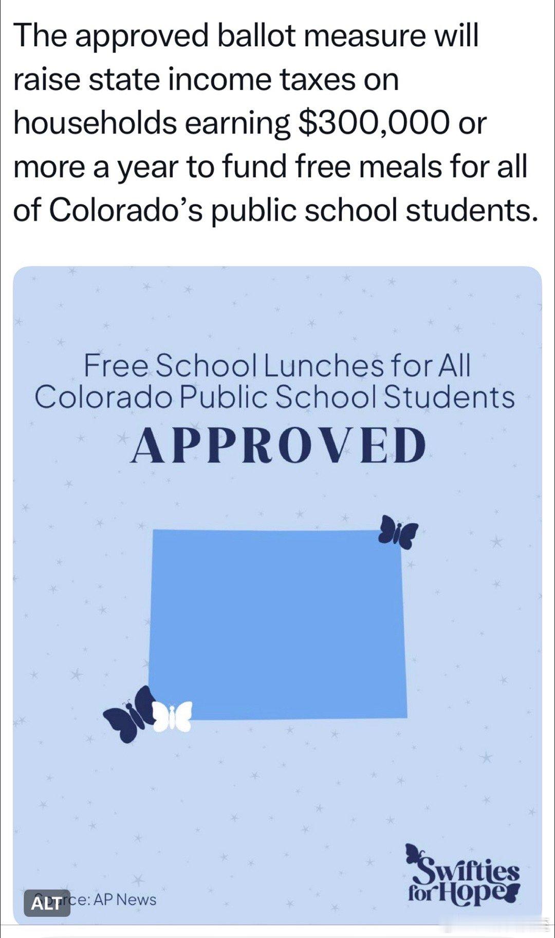 科罗拉多州选民投票通过:年收入三十万以上的个人或家庭多交税,给全州公立中小学所有学生提供免费早餐和午餐