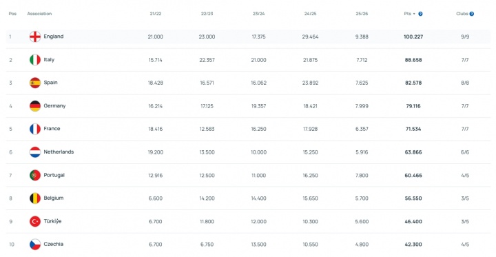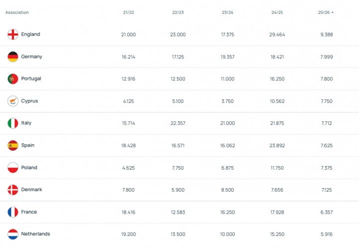 直播吧11月06日讯欧冠联赛阶段第四轮比赛全部结束,欧战本赛季最新积分更新,英格兰居首,德国、葡萄牙分列二三,塞浦路斯第四。而在近5赛季欧战总积分上,英格兰、意大利、西班牙、德国、法国排在前五。