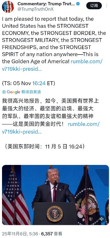 特朗普今天(北京时间11月6日)表示:“我很高兴地报告,如今,美国拥有世界上最强大的经济、最坚固的边境、最强大的军队、最牢固的友谊和最强大的精神 -这是美国的黄金时代!” 先说这“最强大的经济”,听着确实提气,美国GDP常年稳坐全球头把交椅,华尔街那帮大佬动动手指就能搅动国际市场。 可普通老百姓的日子真那么舒坦吗?通胀这玩意儿跟狗皮膏药似的撕不下来,超市里鸡蛋牛奶价格蹭蹭涨,工资涨幅却跟蜗牛散步似的。 联邦政府的债务更是堆成了山,35万亿美元的窟窿,子孙后代怕是都得勒紧裤腰带还债。企业倒是赚得盆满钵满,可利润大头都进了股东腰包,中产阶层缩水得跟脱水蔬菜似的,贫富差距拉得能塞进太平洋。 这种“强大”,更像是给少数人镀的金,普通民众摸着的怕是黄铜。再扯到“最坚固的边境”,这话估计得让德州州长笑出声。 美墨边境那道墙修修停停,跟拉链似的开开合合,非法移民照样成群结队往里钻。边境巡逻队天天累得像陀螺,抓了一批又来一批,根本忙不过来。 那些移民帐篷扎得跟蘑菇圈似的,人道主义危机时不时爆个雷。特朗普当年喊的“建墙”口号,到现在还半拉子工程悬在那,所谓的“坚固”怕不是活在PPT里。 倒是墨西哥毒贩子们,挖地道玩得比谁都溜,边境线成了筛子,这“坚固”二字怕是得打上好几个问号。 至于“最强大的军队”,美军确实装备精良,航母战斗群开到哪都是大爷,军费开支比后面十几个国家加起来还多。 可这钱花得值吗?阿富汗撤军那狼狈样,塔利班追着飞机跑的画面全球直播,脸打得啪啪响。 F-35战机单价上亿美元,故障率却高得离谱,飞行员开着都心慌。核潜艇倒是威风,可保养费用能把国会老爷们愁白头。 更别提军队里那堆烂事,性侵丑闻、种族歧视隔三差五上头条。 这种“强大”,看着唬人,实则虚胖,真打起硬仗来,怕是得先掂量掂量钱包和士气。“最牢固的友谊”这话就更逗了。 特朗普当总统那会儿,跟盟友闹得跟仇人似的,北约军费说撕就撕,贸易战大棒抡得呼呼响。 欧洲领导人见了他跟见债主似的,笑里藏刀。拜登倒是想修复关系,可法国潜艇订单被截胡那事,马克龙气得差点掀桌子。 亚太这边,日本韩国倒是天天点头哈腰,可心里的小算盘打得噼啪响,真有事谁肯当炮灰?所谓的“友谊”,更像是利益捆绑的临时组合,风一吹就散,哪来的“牢固”可言。 最后这“最强大的精神”,简直让人笑掉大牙。美国社会现在撕裂得像块破布,红州蓝州跟世仇似的,选举闹得跟宫斗剧。 枪击案天天上头条,校园里孩子们得练防弹演习。毒品泛滥得比咖啡还普及,无家可归者扎营在市中心。所谓的“美国梦”,现在更像是“美国噩梦”,年轻人躺平摆烂,中产焦虑失眠。 这种“精神”,怕不是靠嗑药才能维持的虚假繁荣。 特朗普这番“黄金时代”的宣言,听着像是给支持者打鸡血,可现实骨感得很。 经济数据再好看,老百姓兜里没钱都是白搭;军队装备再先进,士气低落照样抓瞎;盟友关系再嘴硬,利益面前照样翻脸。 美国确实还是个超级大国,可这“黄金时代”怕是活在特朗普的梦里头。 真实的美利坚,更像是一辆外表锃亮、引擎漏油的豪车,看着风光,开起来咯吱作响,指不定哪天就趴窝在半道上了。
