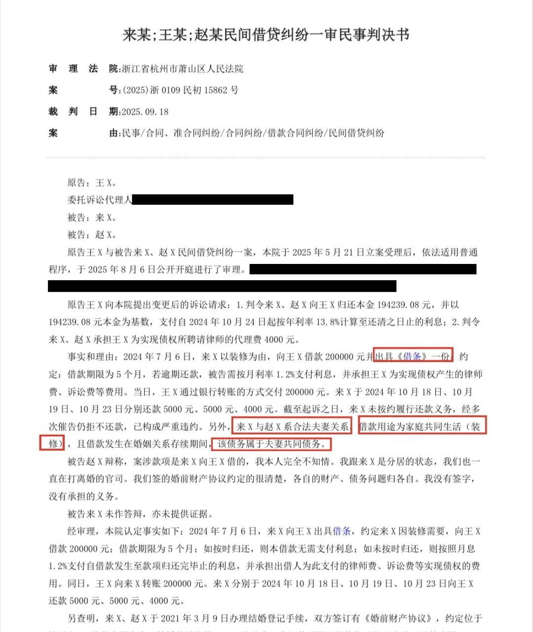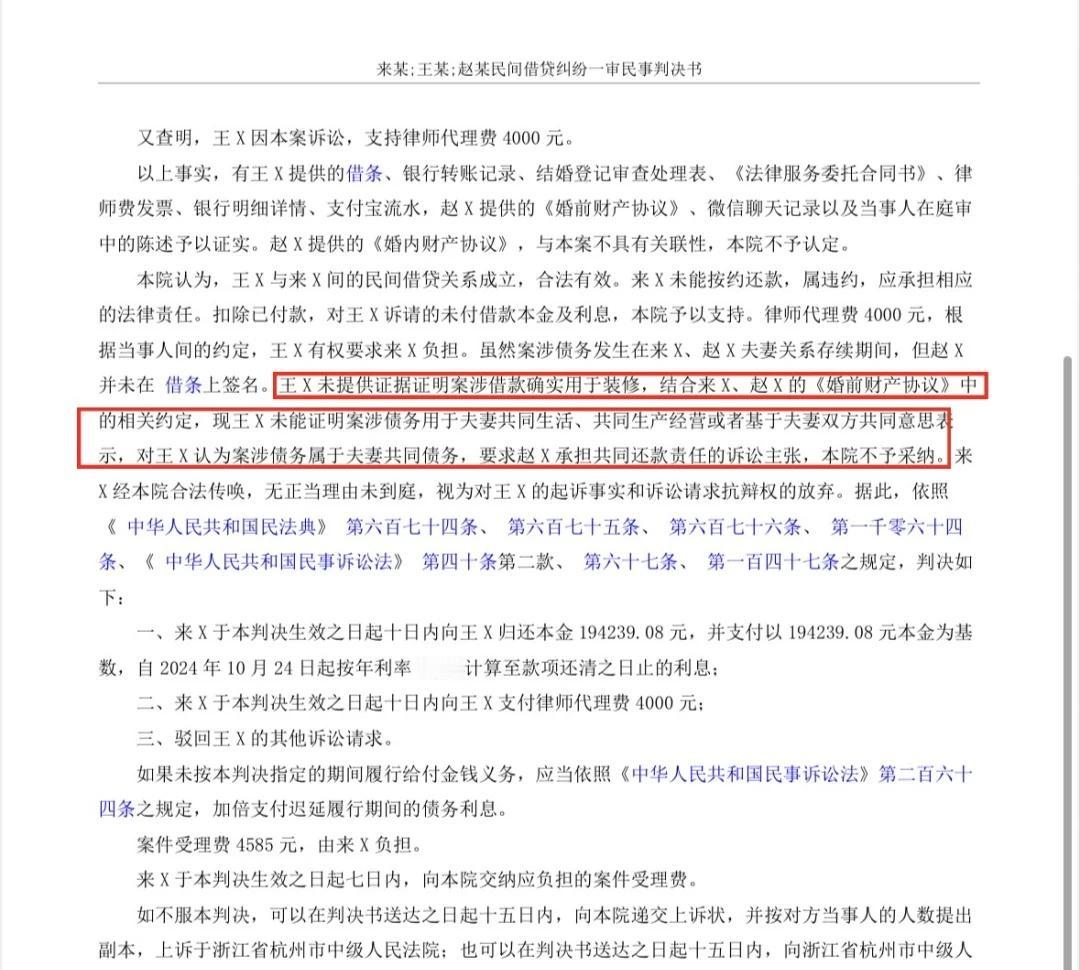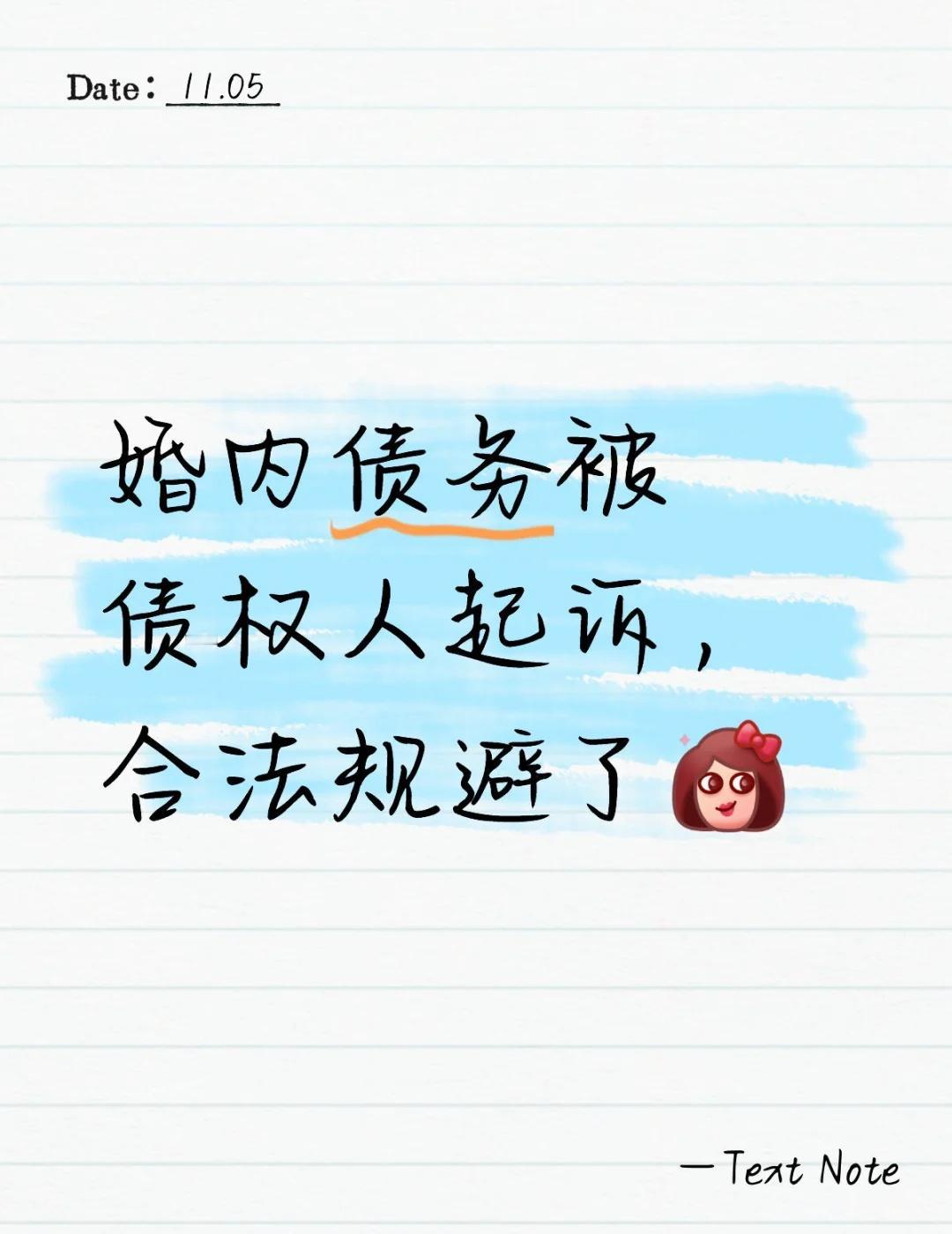 婚内发生的债务,另一半被冤枉起诉 标题党了一下,没什么合法规避,本来就不属于自己的债!!! 可以说几乎每一个律师都会遇到亲朋好友的问题,我老公(老婆)背着我在外面欠了债,我要跟着一起还吗?跟着本案一起学: [一]婚前就签了婚前财产协议书,明确了各自的财产和债务归各自。即使发生在婚后的债务,也与我无关。 [二]对于婚后欠债,你没花的,就不要在借条上签字。签了字代表有共同的意思表示了,说明你同意跟他一起还。 [三]婚后欠的债,没有用于夫妻共同生活和共同经营,比如买车、买房、装修,这类显然是共同开销上的或者你俩婚后共同做的小生意上。债权人要主张你一起还钱,那么债权人需要举证证明这个钱你也用上了。 符合上面三个点,即使发生在婚后老公背着你欠的💰,你凭什么要主动凑上去帮着还呢。 杭州律师 民间借贷夫妻共同债务 借条