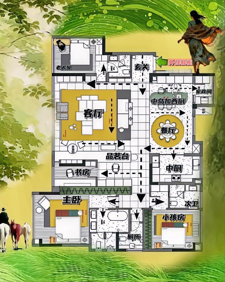 有人问,横厅有了,算不算真正的改造?不算,说白了格局光炫技,功能不够格! 208 ㎡感觉道理很简单呀,房间变少了,布局自然就有灵气! 动线要有洒脱的韵味,格局讲究深沉! 第一个亮点,双岛台。 短的做水吧,长得煮茶喝,同是水系,却呈现不同的生活氛围,一个洄洄游,另一个半洄游,功能却不同!解决问题也不一样! 七米茶台,最大的作用,是背景墙! 三米半中岛,吃早餐! 共同点,给九米横厅,也是给围合式沙发布局,做屏风! 另一个亮点,在于厕所! 硬生生归纳出,四个卫生间,配三房,看着不合理,生活却是讲道理,不要内系关,挤出一个第四厕所,即使全家通勤不着急! 这个相依为命的三卫生间,才是真正的大平层的智慧! 初看布置很急急,后思动线讲道理,横厅套竖厅,格局大圆满!