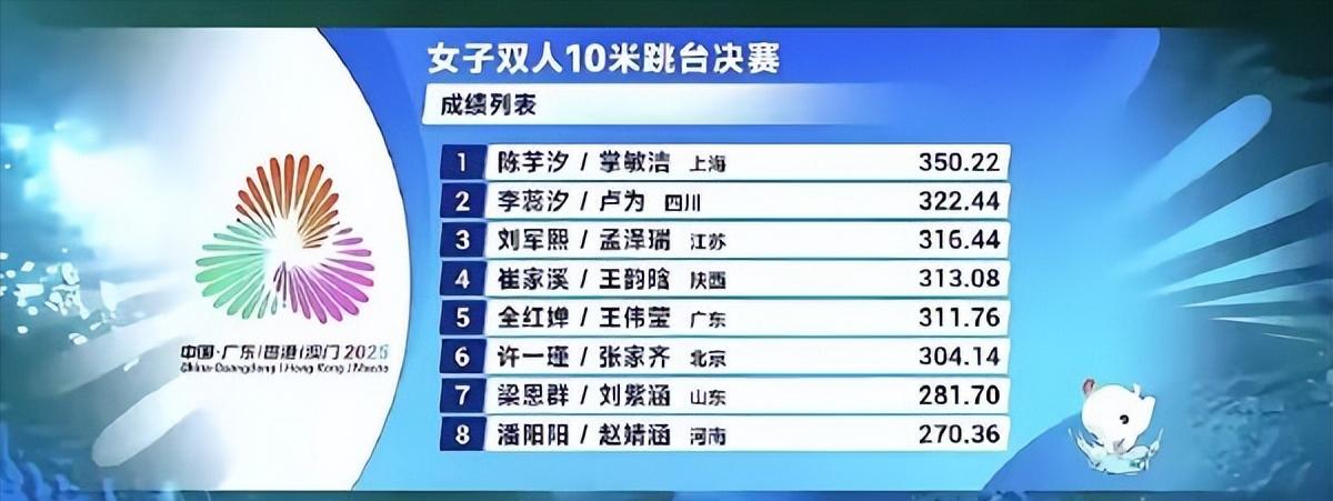 陈芋汐全红婵都有金牌了 大湾区全运会跳水赛今天结束了女子双人10米台和男子双人3米板两项比赛。女子双人10米台的比赛中,上海的陈芋汐/掌敏洁夺冠,全红婵/王伟莹排在第五。男子双人3米板比赛中,广东队的谢思埸/黄博文夺冠。 女子双人10米跳台决赛,陈芋汐/掌敏洁发挥稳定,从预赛开始就一直领先,决赛中,五跳总分350.22夺得金牌。全红婵/王伟莹两人的能力有差距,配合也不够熟练,预赛之后排在第四,决赛最终排名第五。李蕊汐/卢为银牌,刘军熙/孟泽瑞铜牌。 男子双人3米板比赛中,东道主选手黄博文/谢思埸优势巨大,表现完美,稳定默契,最终总分447.54分,比第二名高出近40分,最终夺冠。